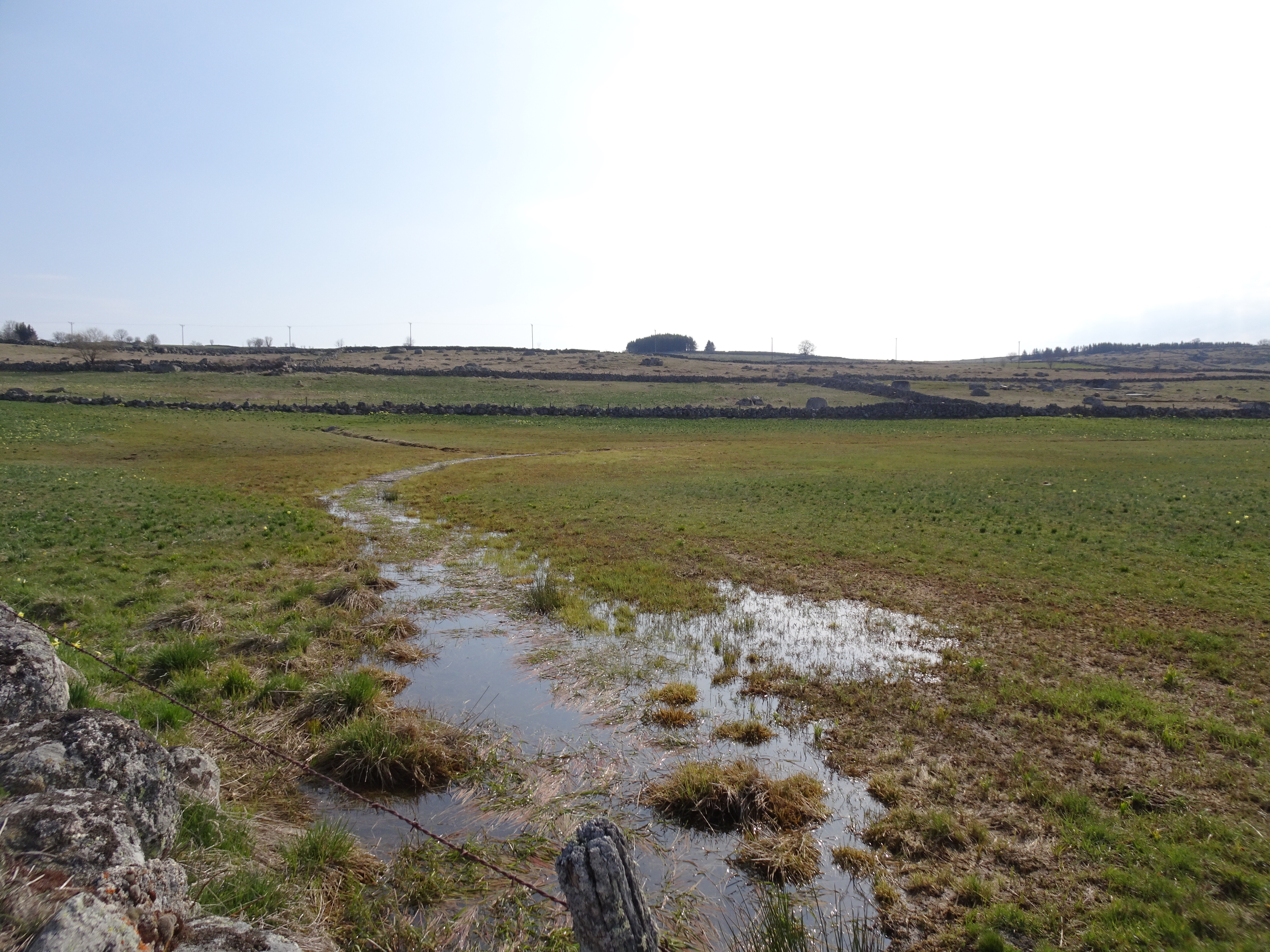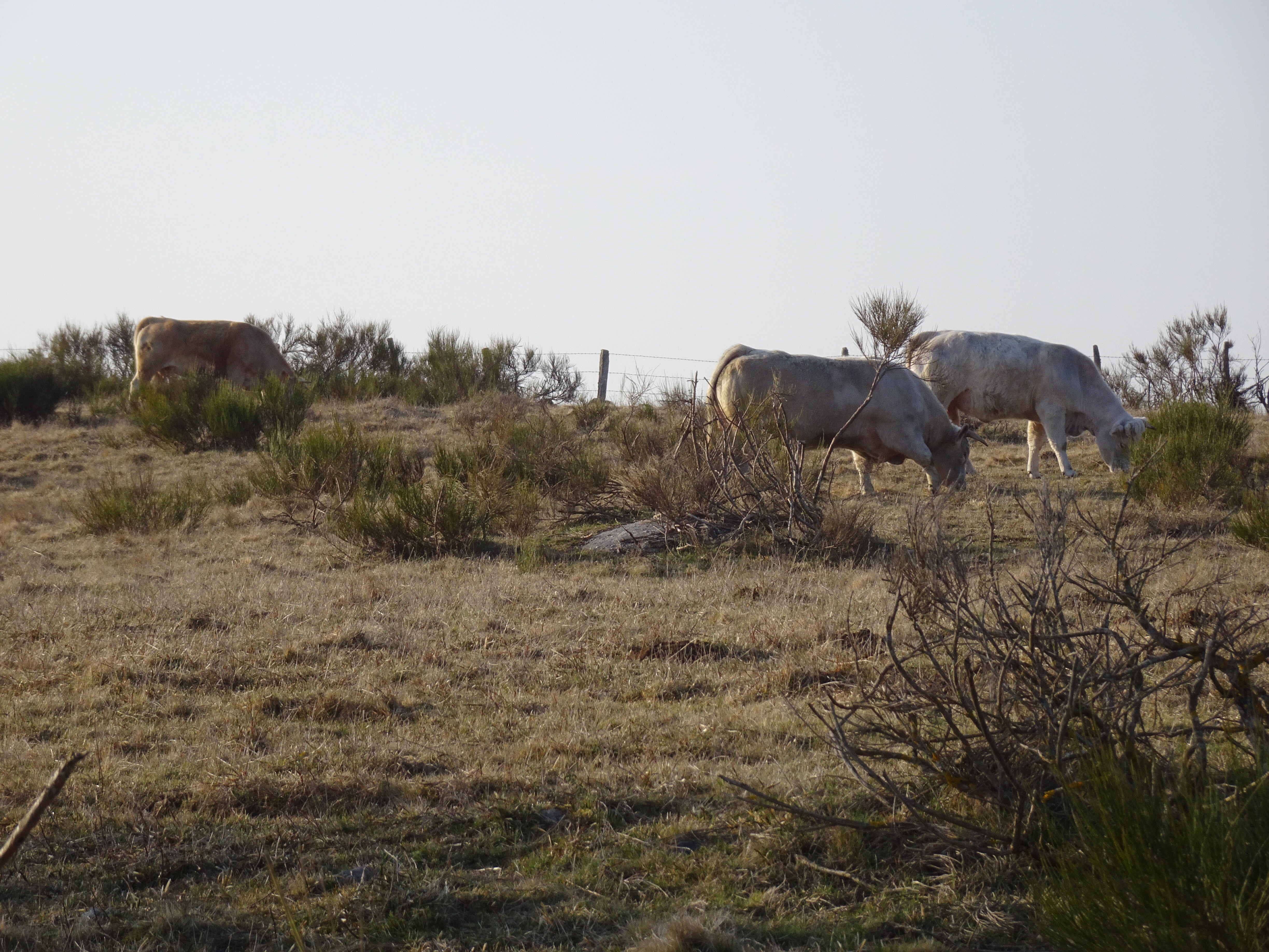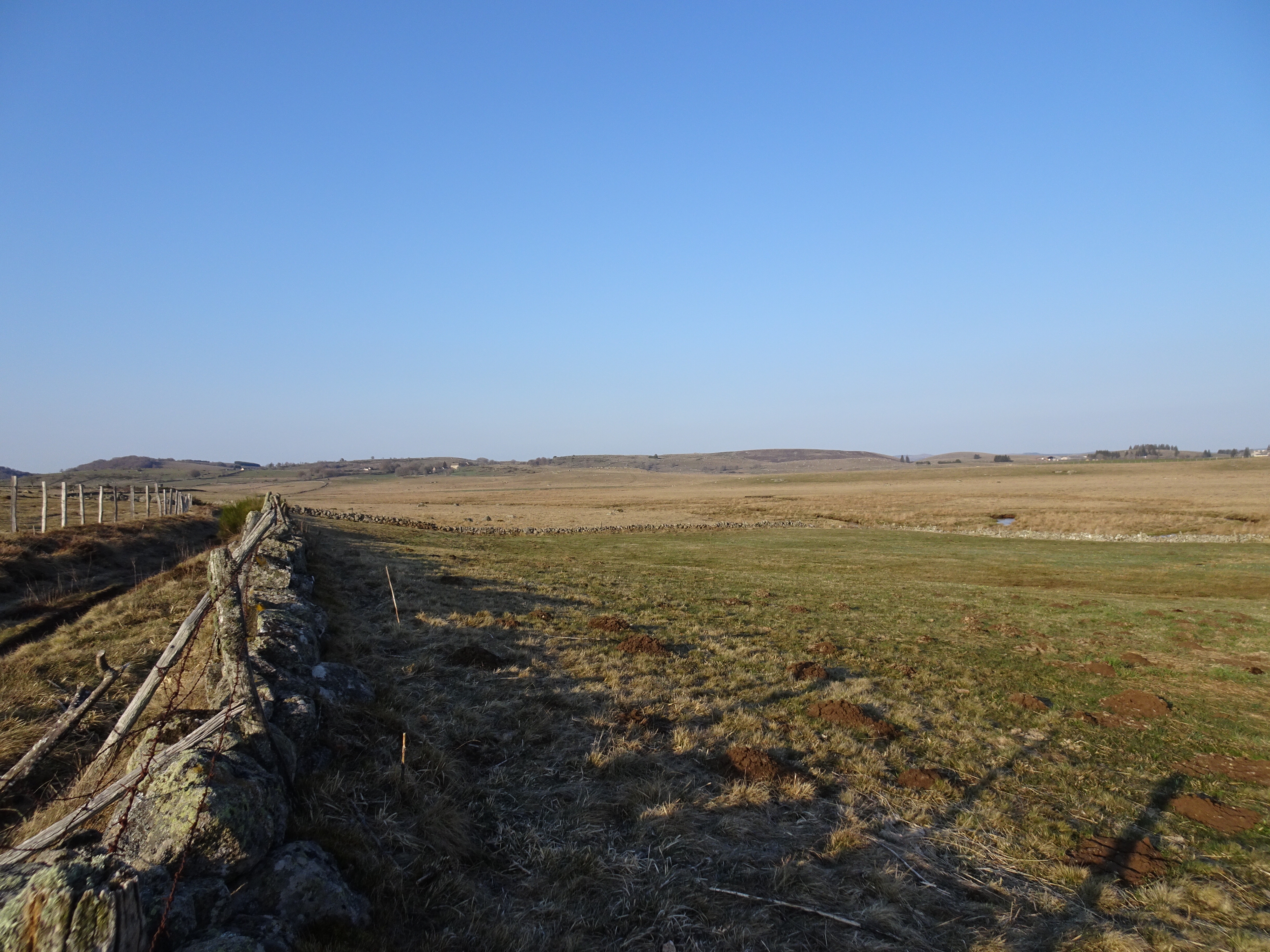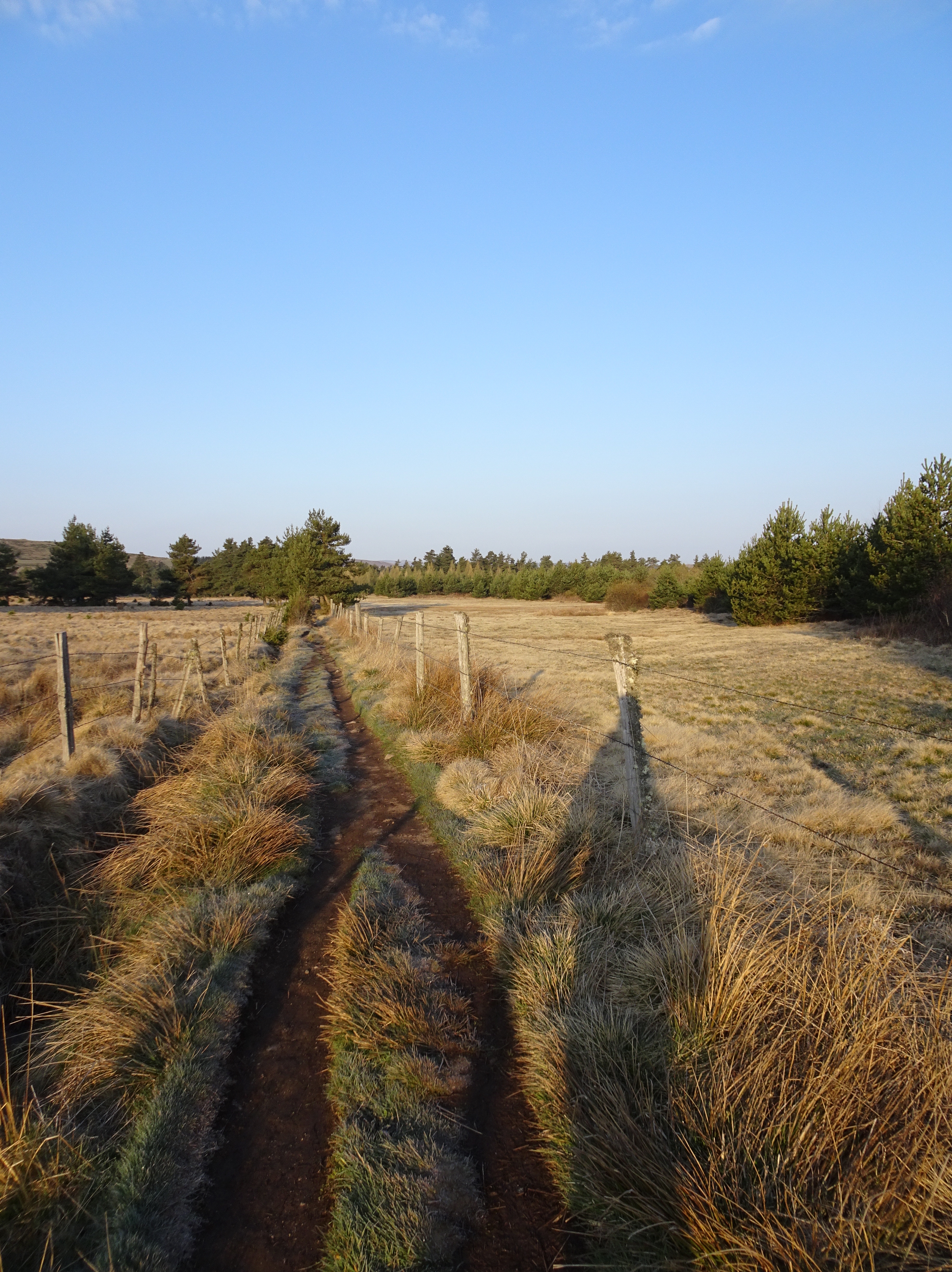 Il a gelé cette nuit, le thermomètre est descendu à -1 degré. La semaine dernière jusqu’à -8 degrés, finalement je ne regrette pas d’avoir différé mon départ de 2 semaines. Apres moins d’un km parcouru le paysage change totalement, nous voici dans l’Aubrac. Avec le givre, les couleurs du matin, les prairies de l’Aubrac, c’est magique. Très peu d’animaux, la transhumance n’aura lieu qu’en mai.