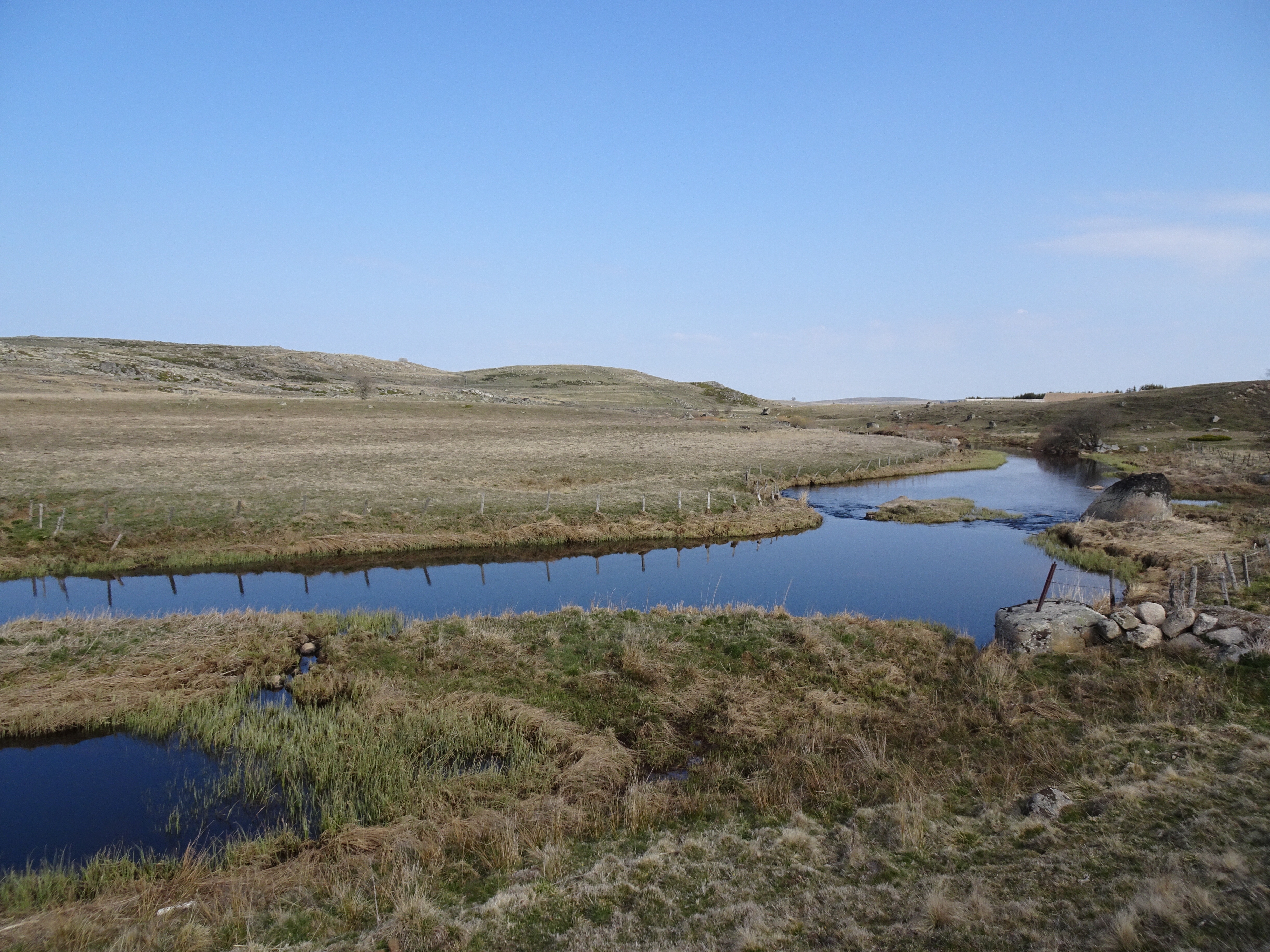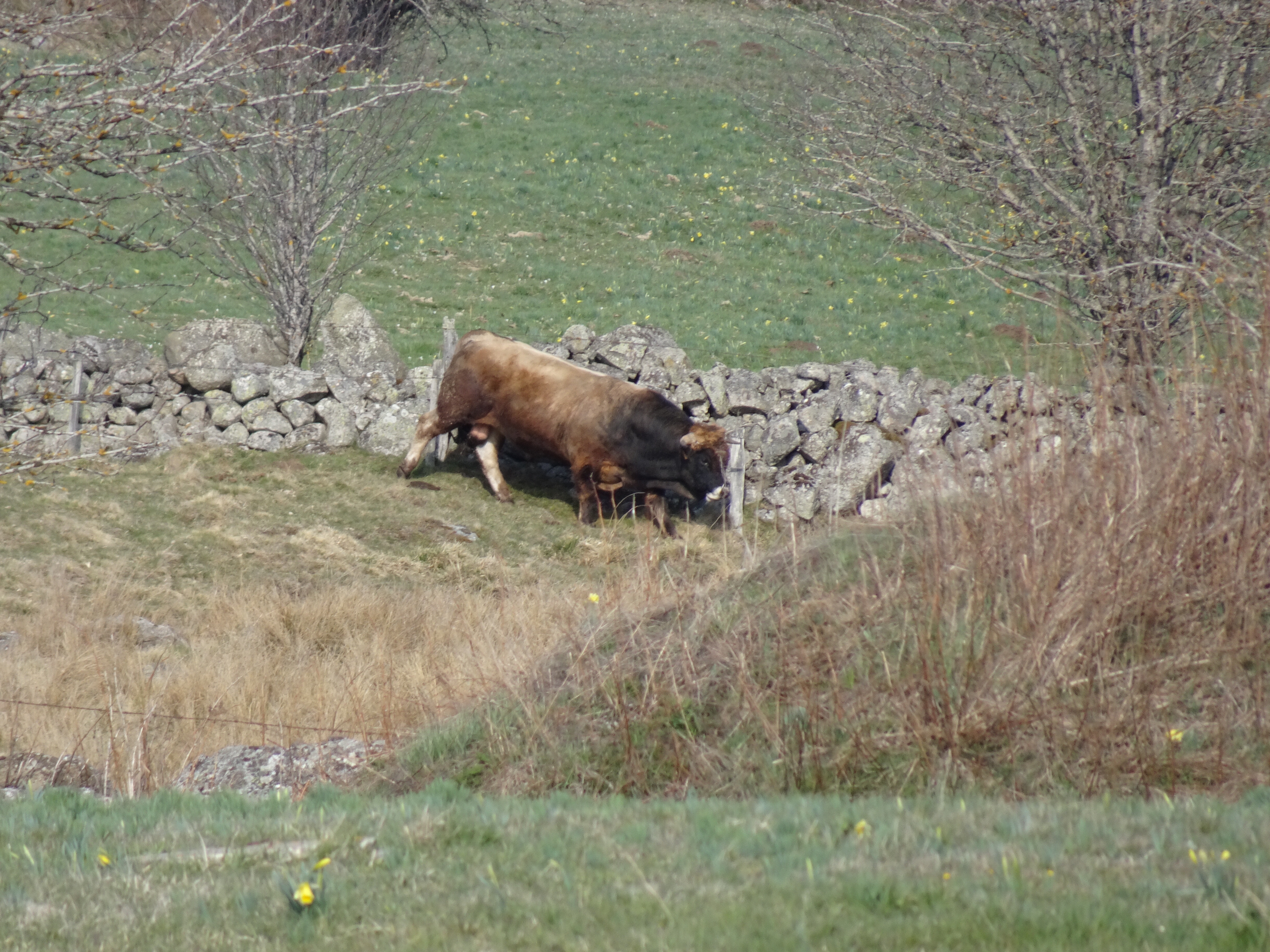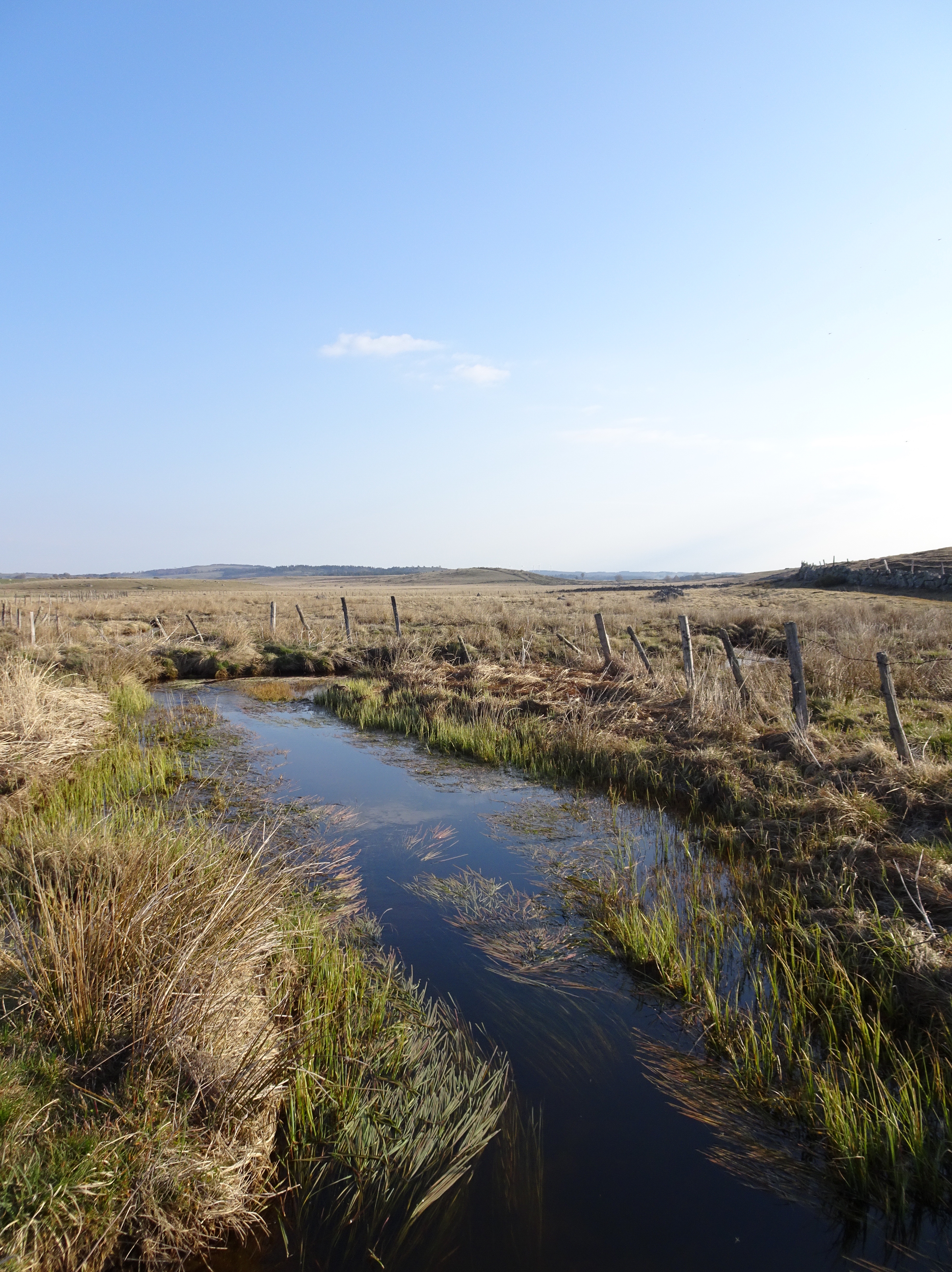 Il a gelé cette nuit, le thermomètre est descendu à -1 degré. La semaine dernière jusqu’à -8 degrés, finalement je ne regrette pas d’avoir différé mon départ de 2 semaines. Apres moins d’un km parcouru le paysage change totalement, nous voici dans l’Aubrac. Avec le givre, les couleurs du matin, les prairies de l’Aubrac, c’est magique. Très peu d’animaux, la transhumance n’aura lieu qu’en mai.