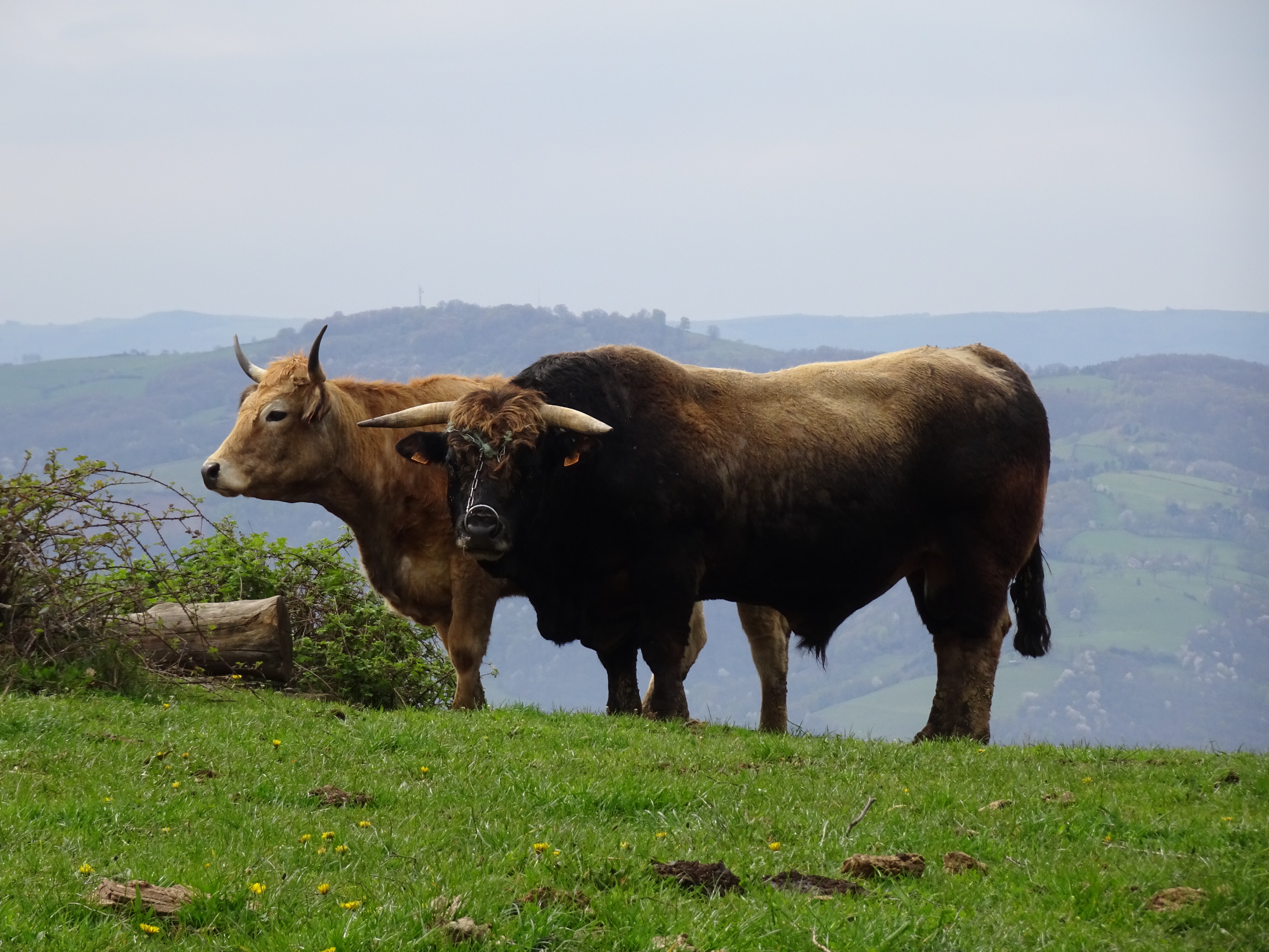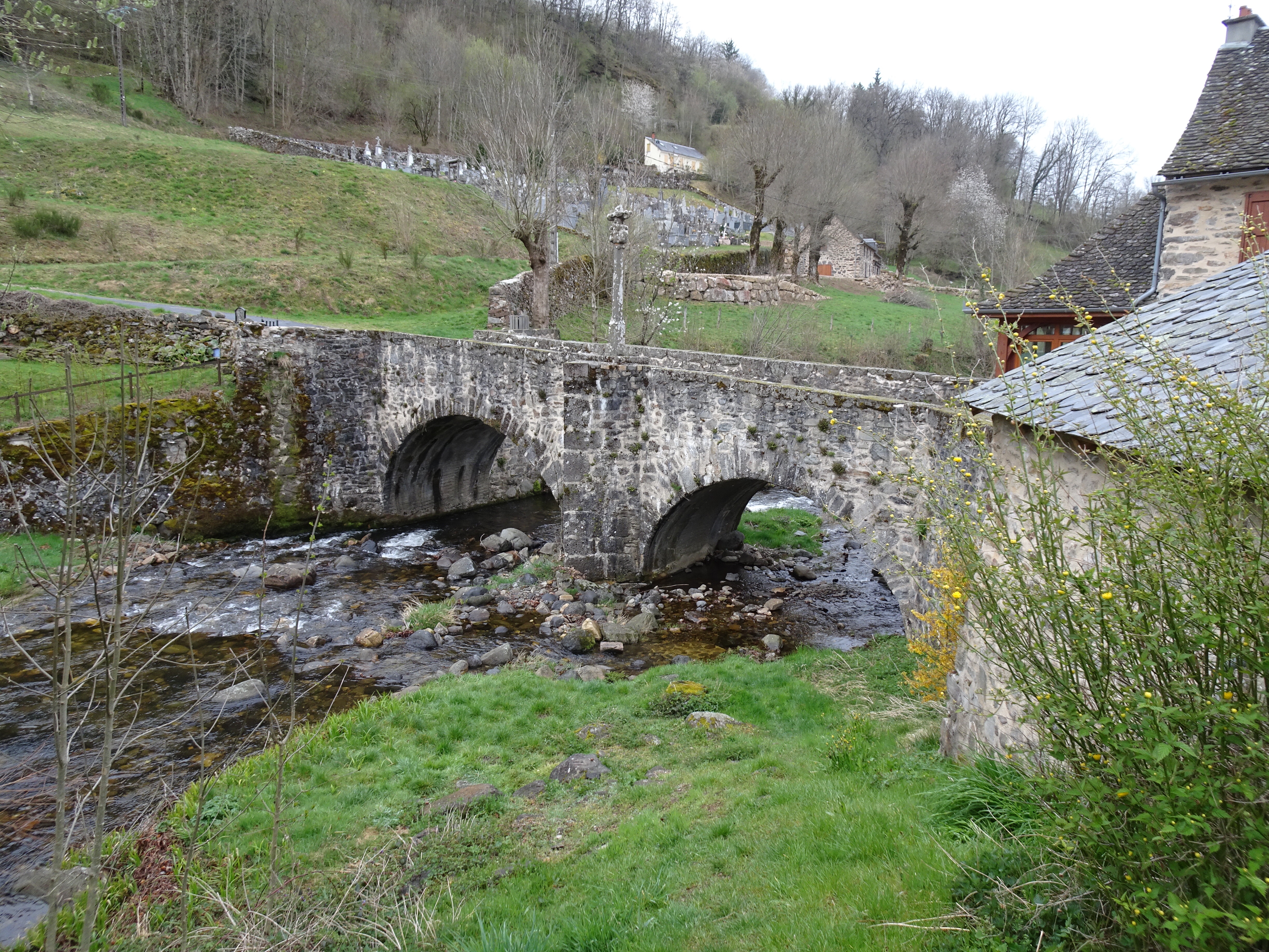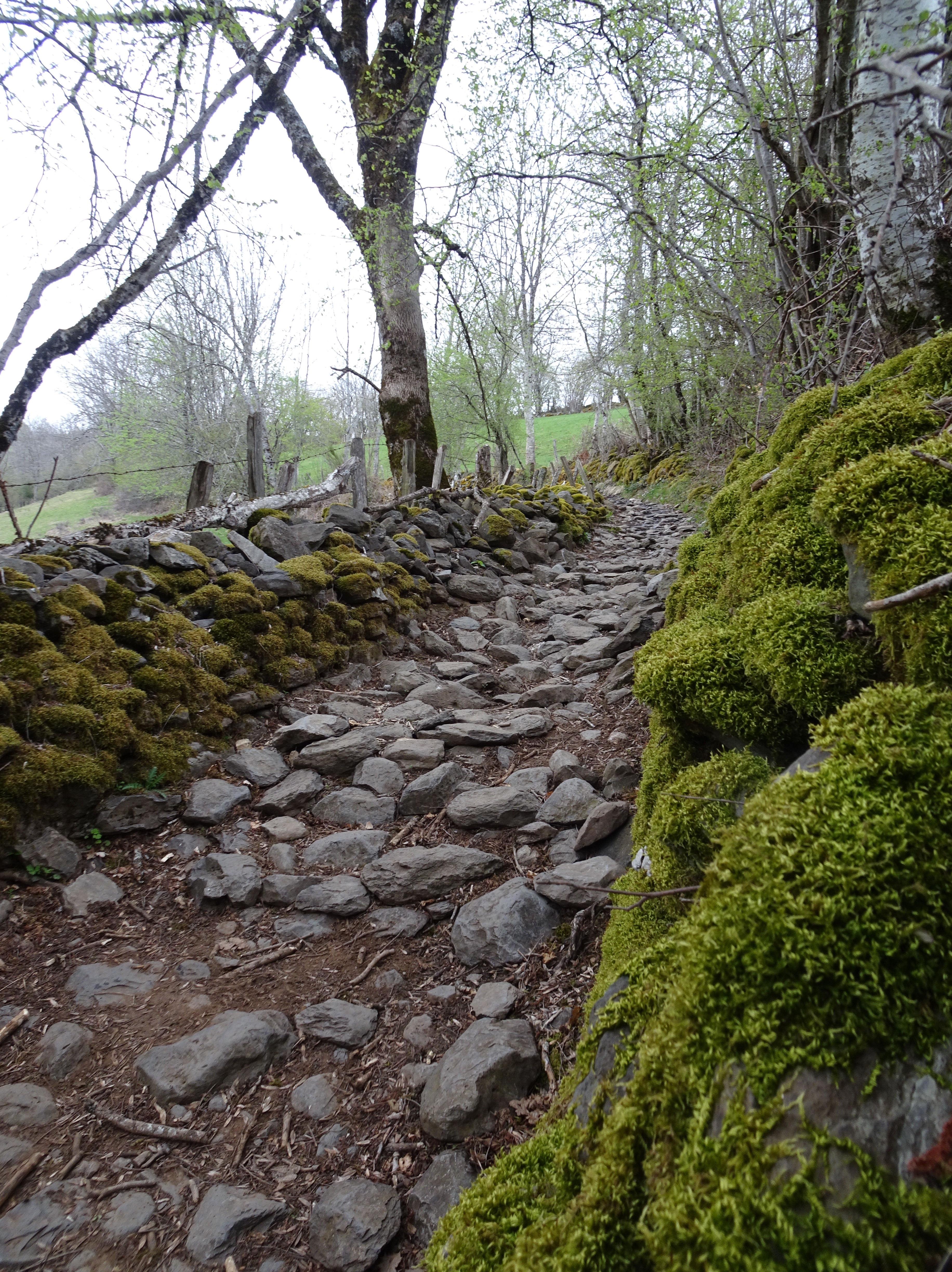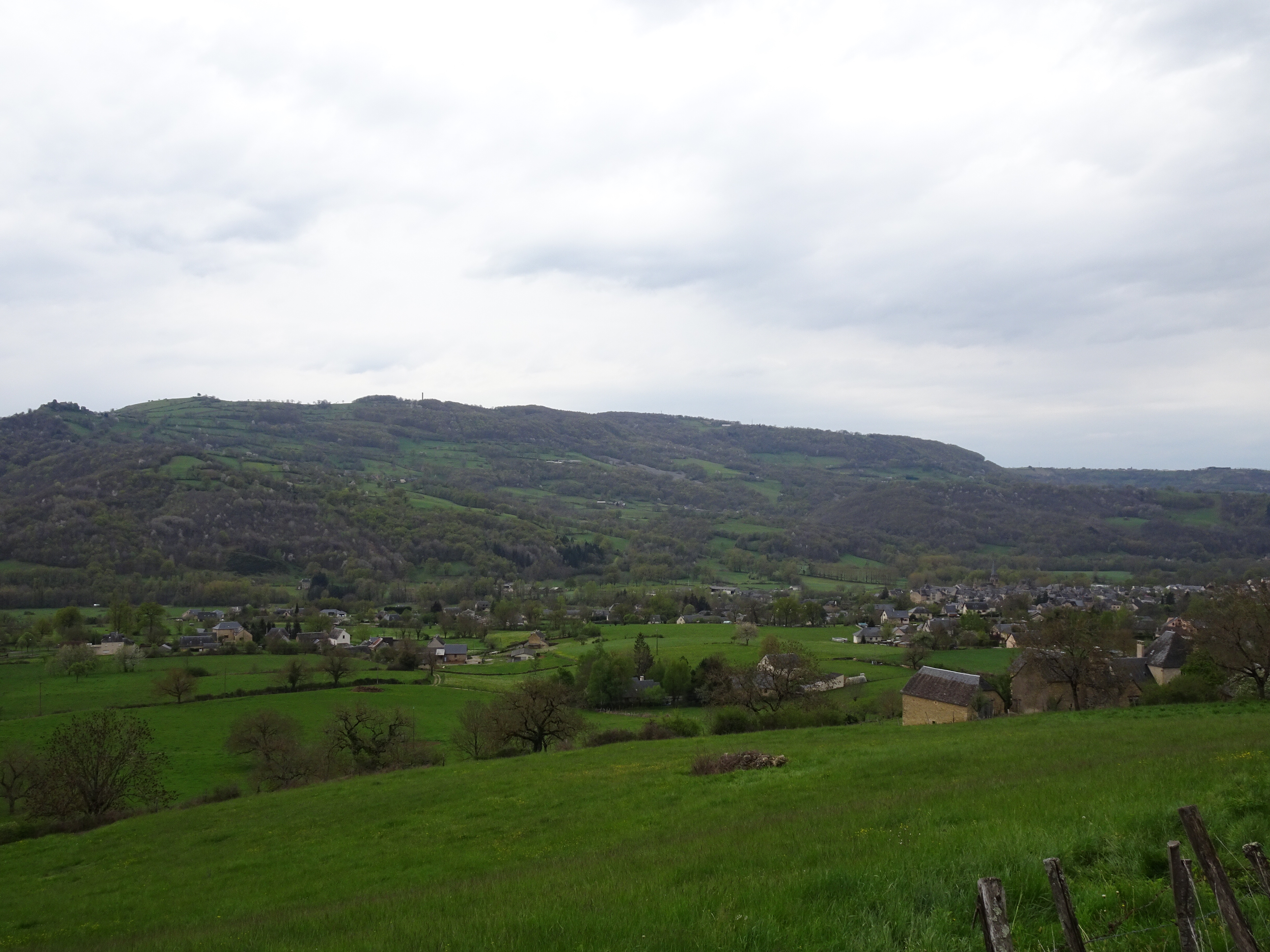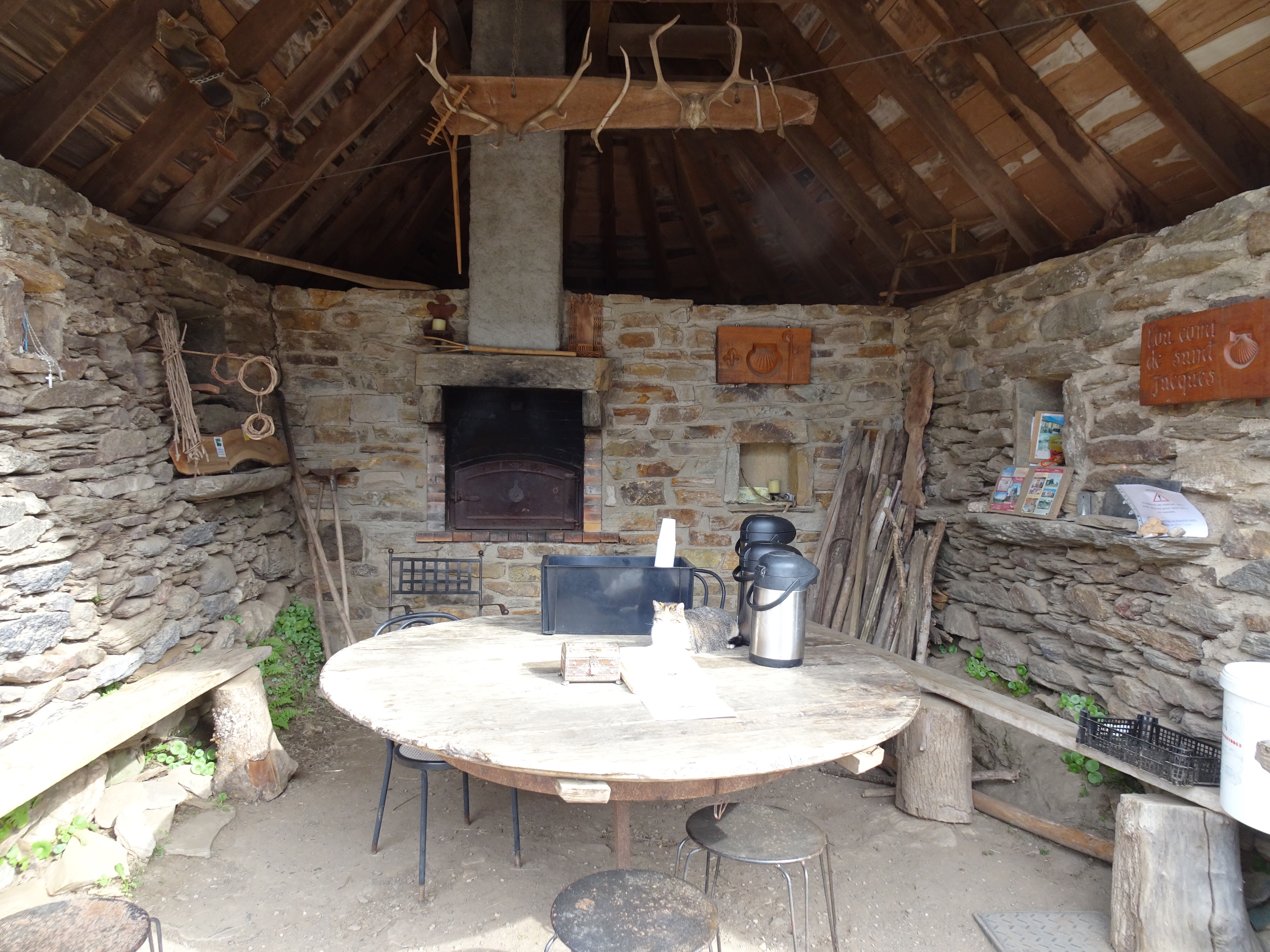 Le ciel est gris mais pas de pluie. Je quitte St-Chély (alt 810m) en traversant le vieux pont classé au patrimoine de l’humanité. Une remontée vers 910m et ensuite une longue longue longue descente de plus de 8km. Petite pause au milieu à Lestrade ou les habitants du hameau propose des boissons chaudes, en libre-service, sous l’auvent du four à pain contre le dépôt d’1€ dans la caisse.