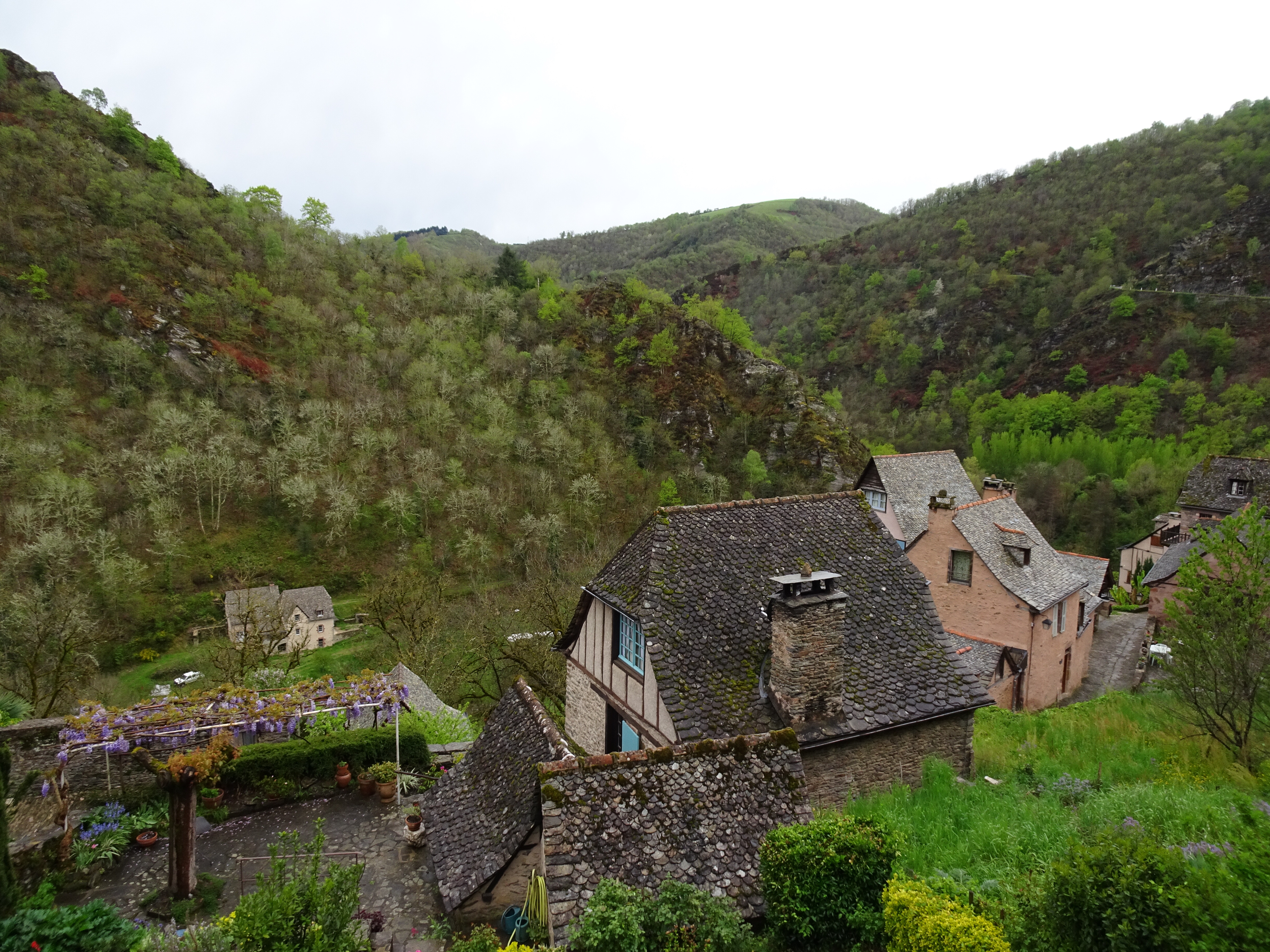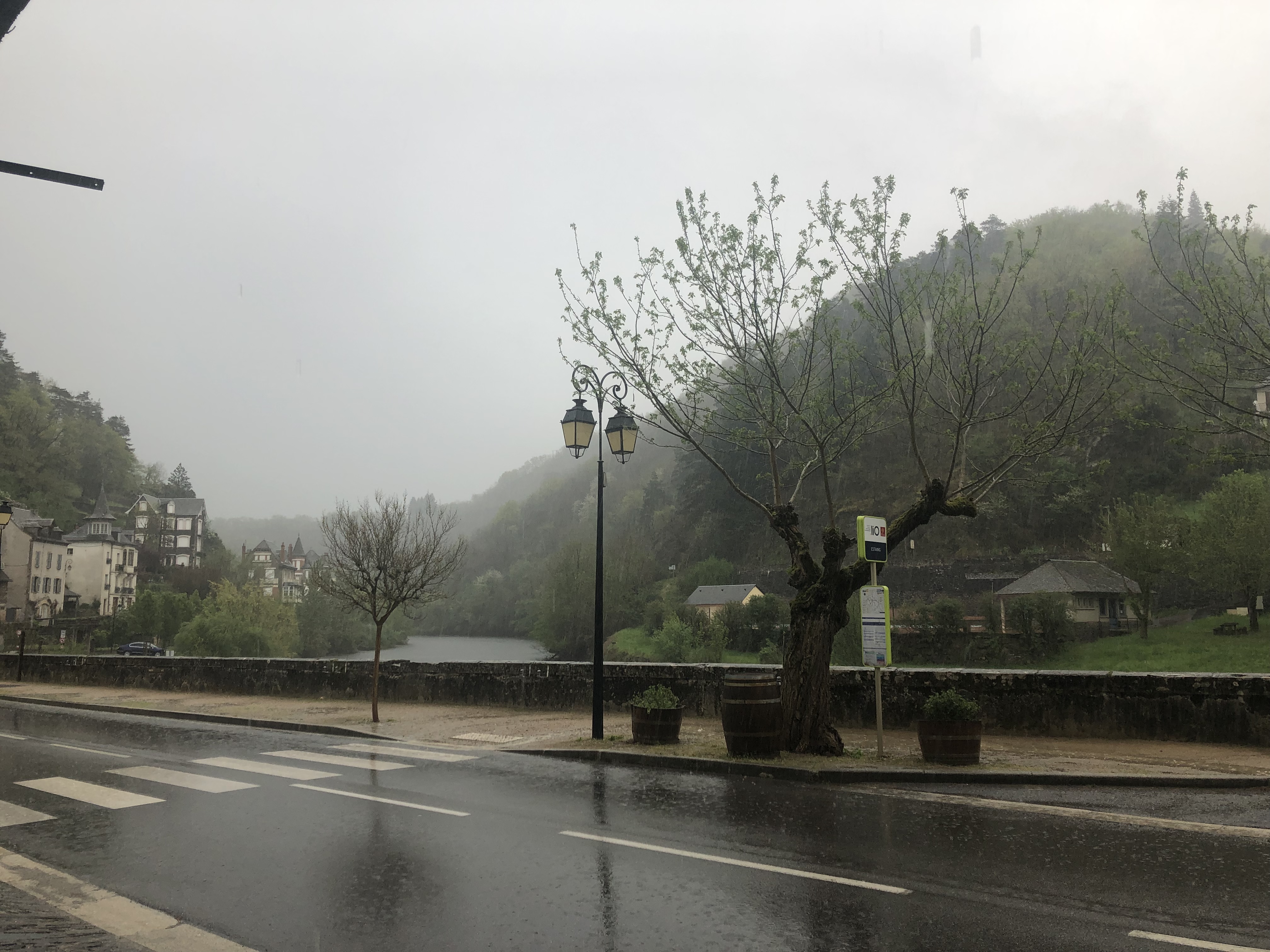 Finalement pas remis de ma douleur au genou et compte tenu du relief qui m’attend, de la pluie qui tombe en abondance, je décide à contrecoeur, mais sans doute est-ce la seule solution pour me laisser la chance de continuer, de prendre le Compostelle-Bus. C’est le service de navette, entre Le Puy-en-Velay et Conques, qui assure le transport des bagages et/ou des randonneurs.
