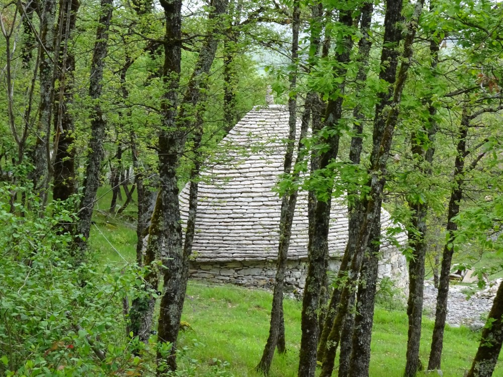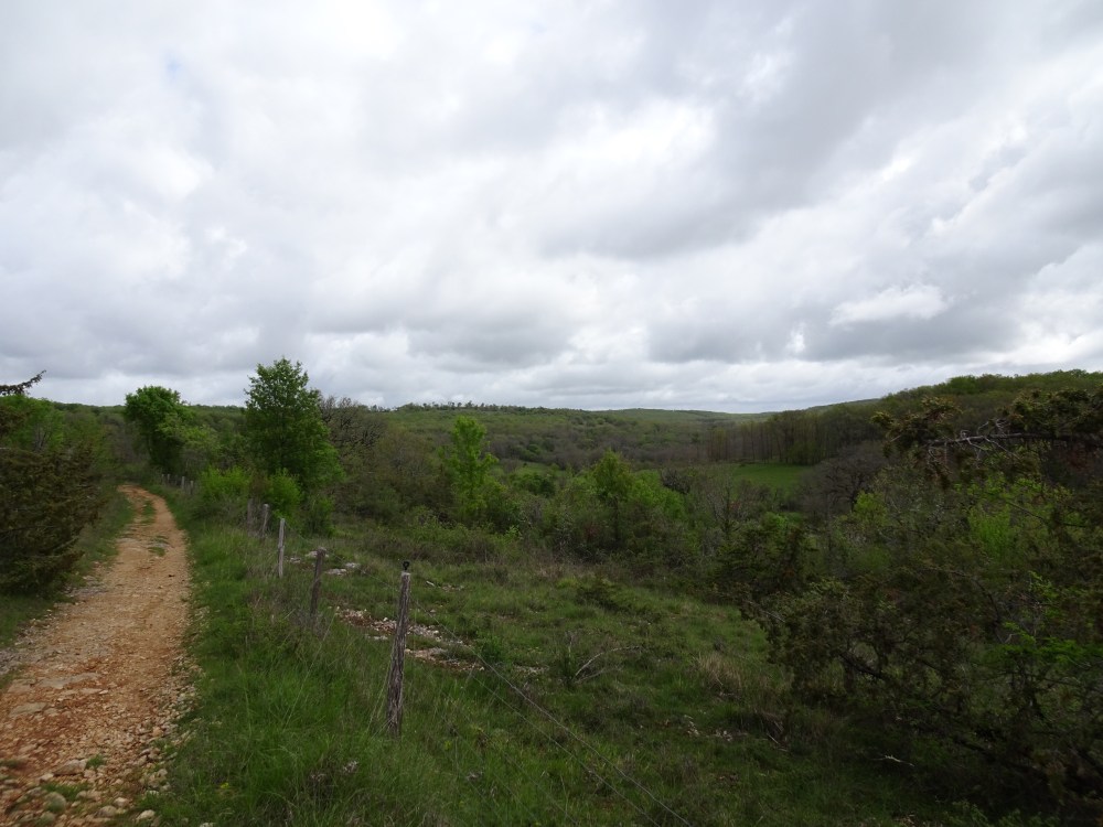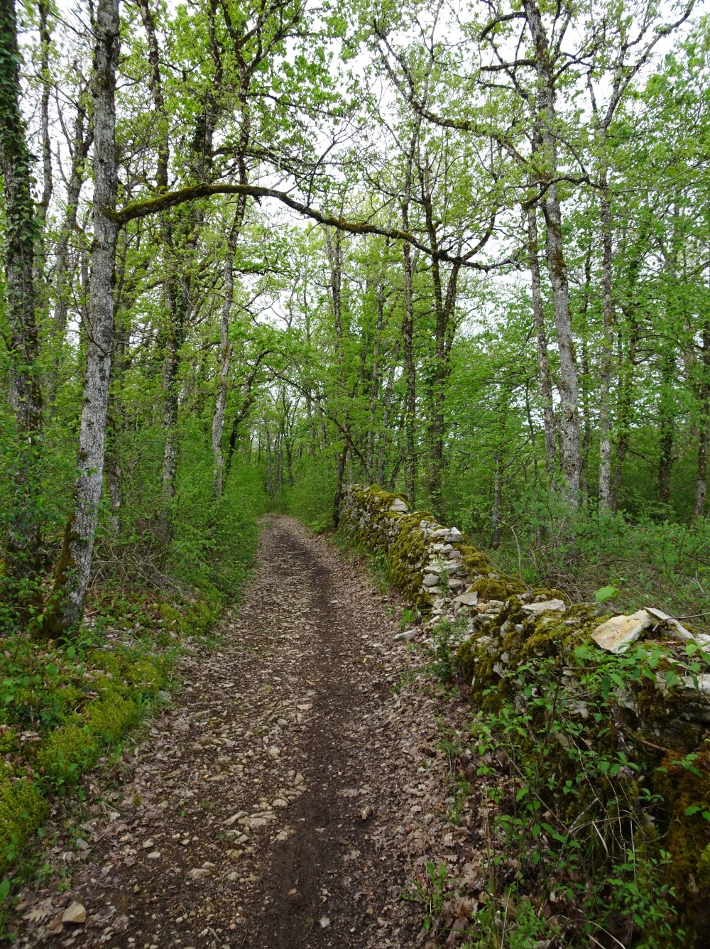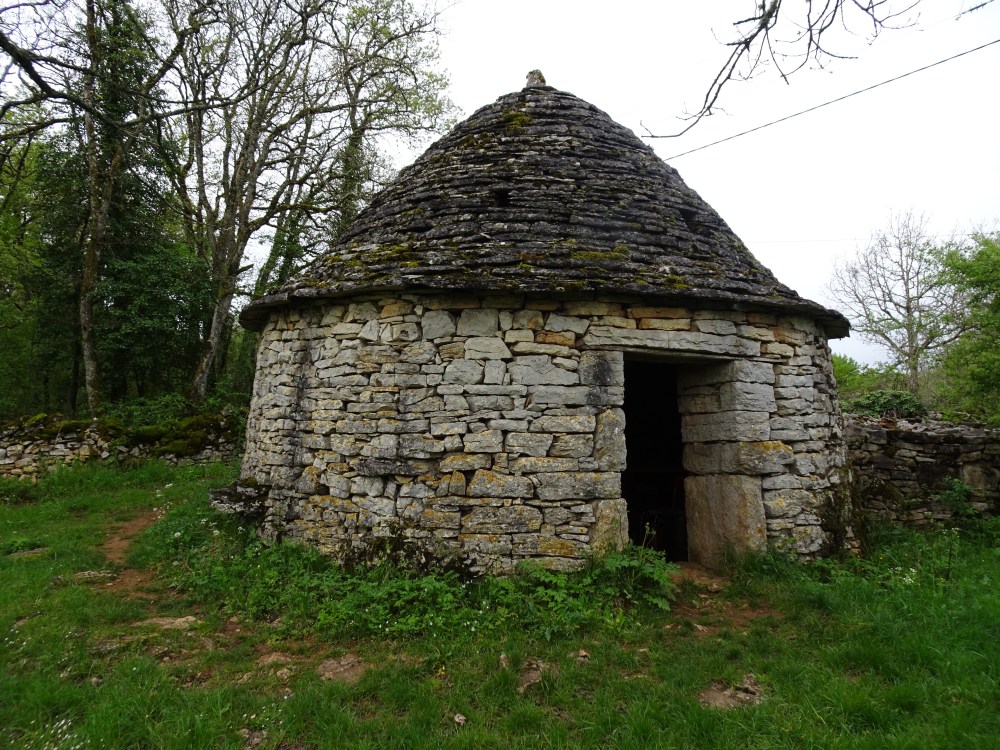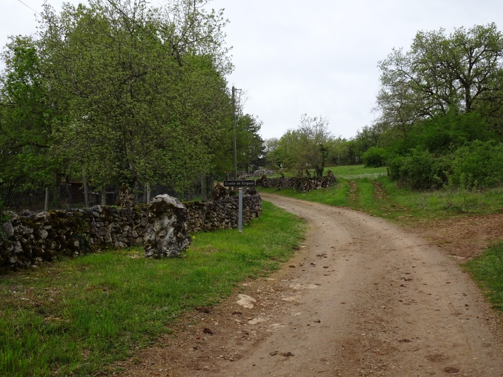 Enfin une journée sans trop de pluie, uniquement quelques petites averses. Je suis entré dans le Parc Naturel Régional des Causses du Quercy. Le chemin est bordé de murets de pierre et dans les champs avoisinants on rencontre régulièrement des “caselles”, petites maisons en pierre qui servaient d’abris pour les bergers ou pour mettre les moutons à l’abri.