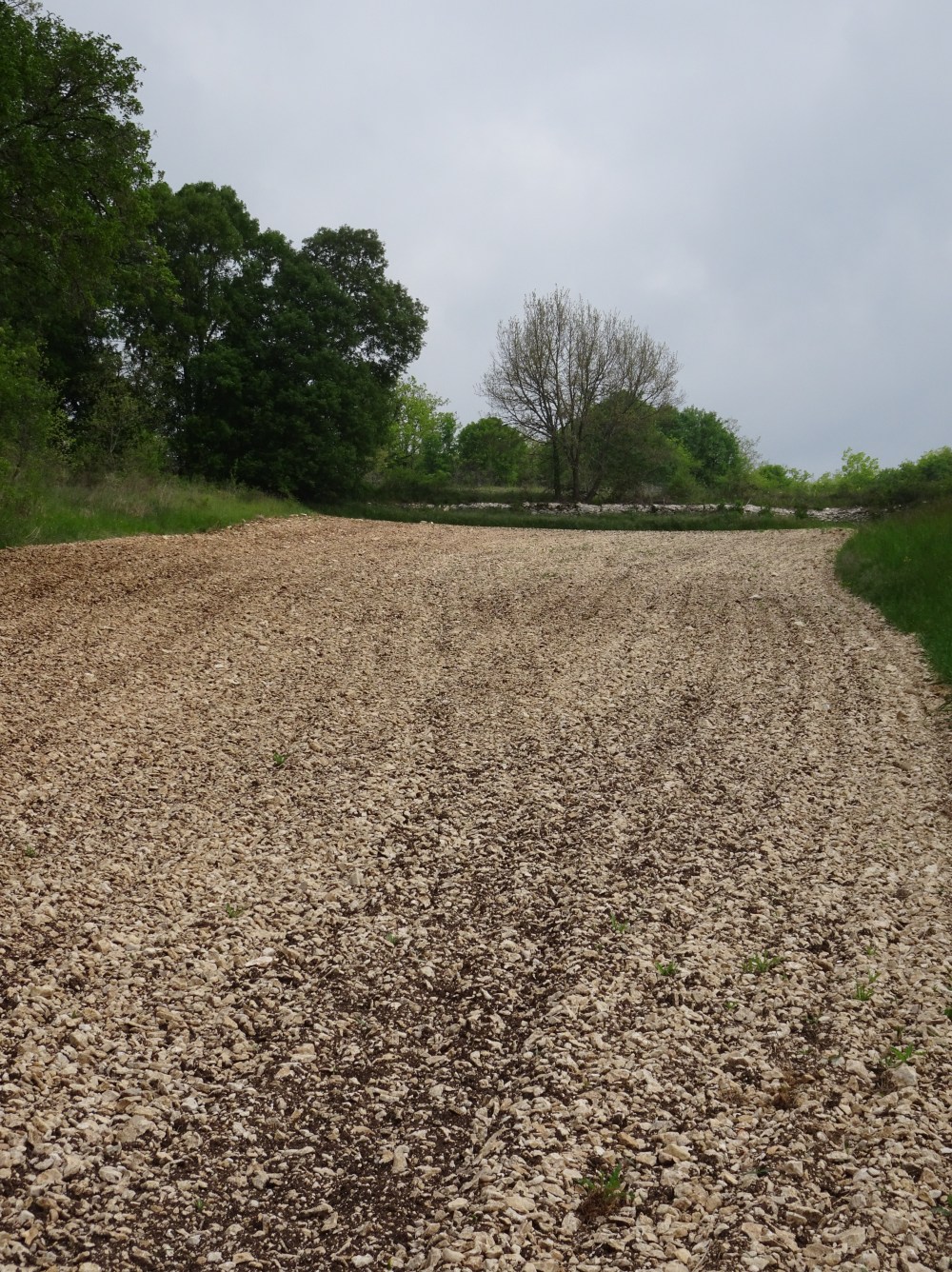 Le chemin descend puis remonte en suivant une ligne de crête. Les champs labourés laissent apparaître tous les cailloux présents dans la terre. Le matériel agricole doit vraiment souffrir avec la nature de ce terrain. Ensuite on redescend dans la vallée, vers le joli village de Lascabanes avec ses maisons en pierre, pour à nouveau remonter sur le Causse dés la sortie du bourg.