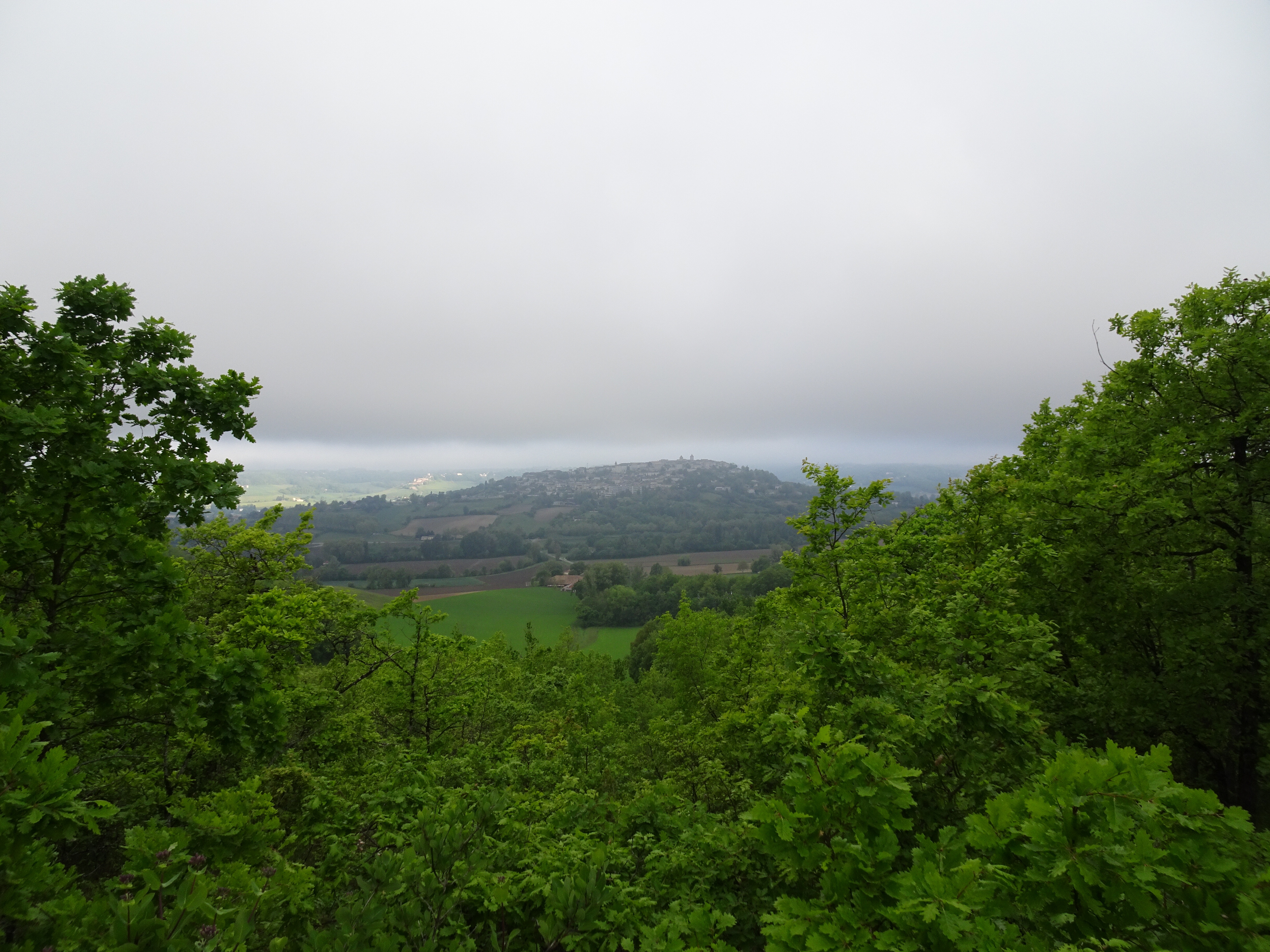 L’étape étant assez longue et voulant passer un peu de temps à visiter Moissac, je pars du gîte peu après 7h30. Lauzerte étant située sur un piton rocheux à 270m d’altitude il me faut redescendre pour remonter aussitôt sur la colline d’en face, ce qui me donne un joli point de vue sur la cité médiévale. Je prends quelques photos mais le ciel gris ne me permet pas de capter l’effet attendu. Malgré tout je prends un réel plaisir à marcher sur ces chemins pendant les premières heures de la matinée.