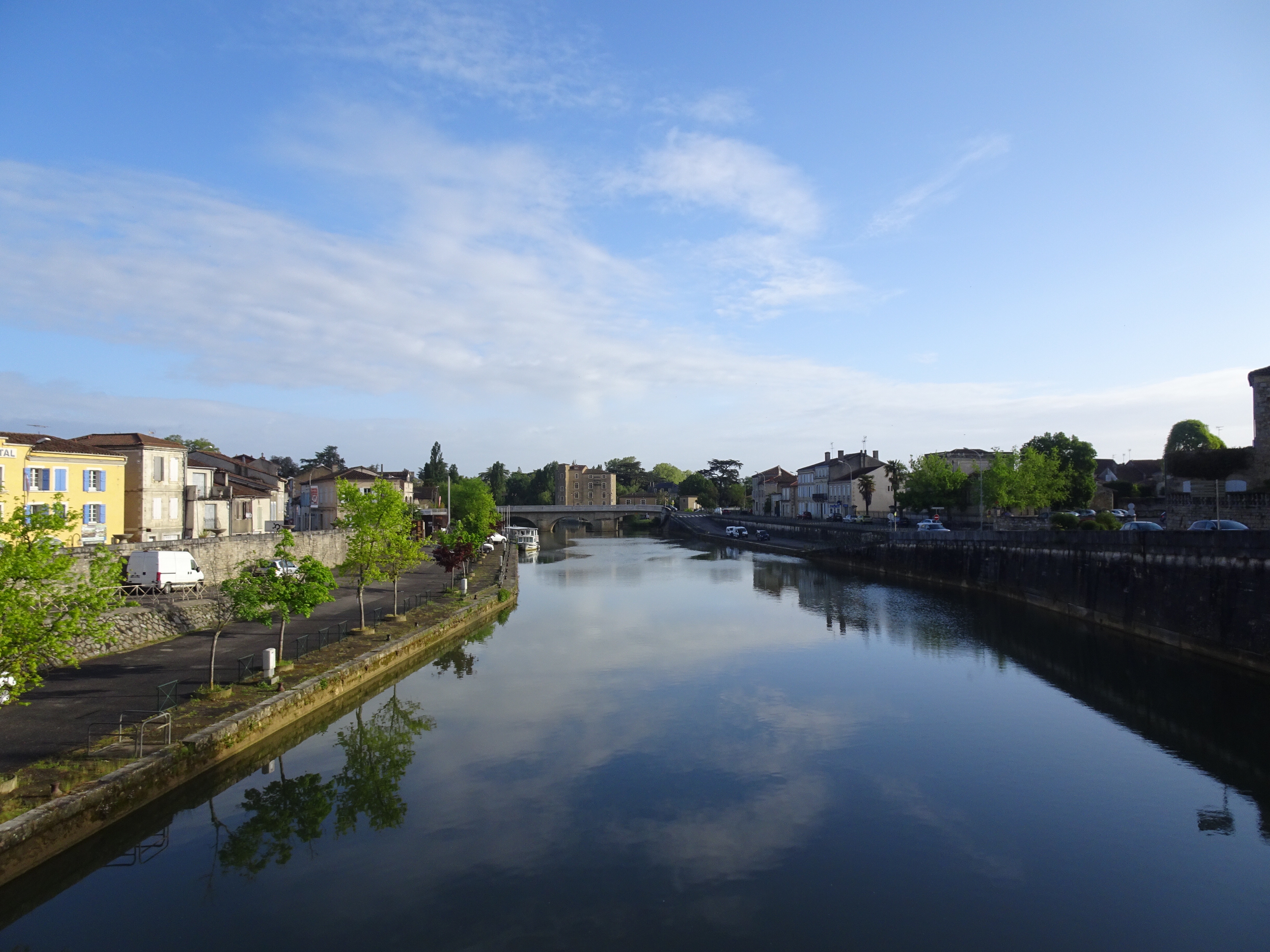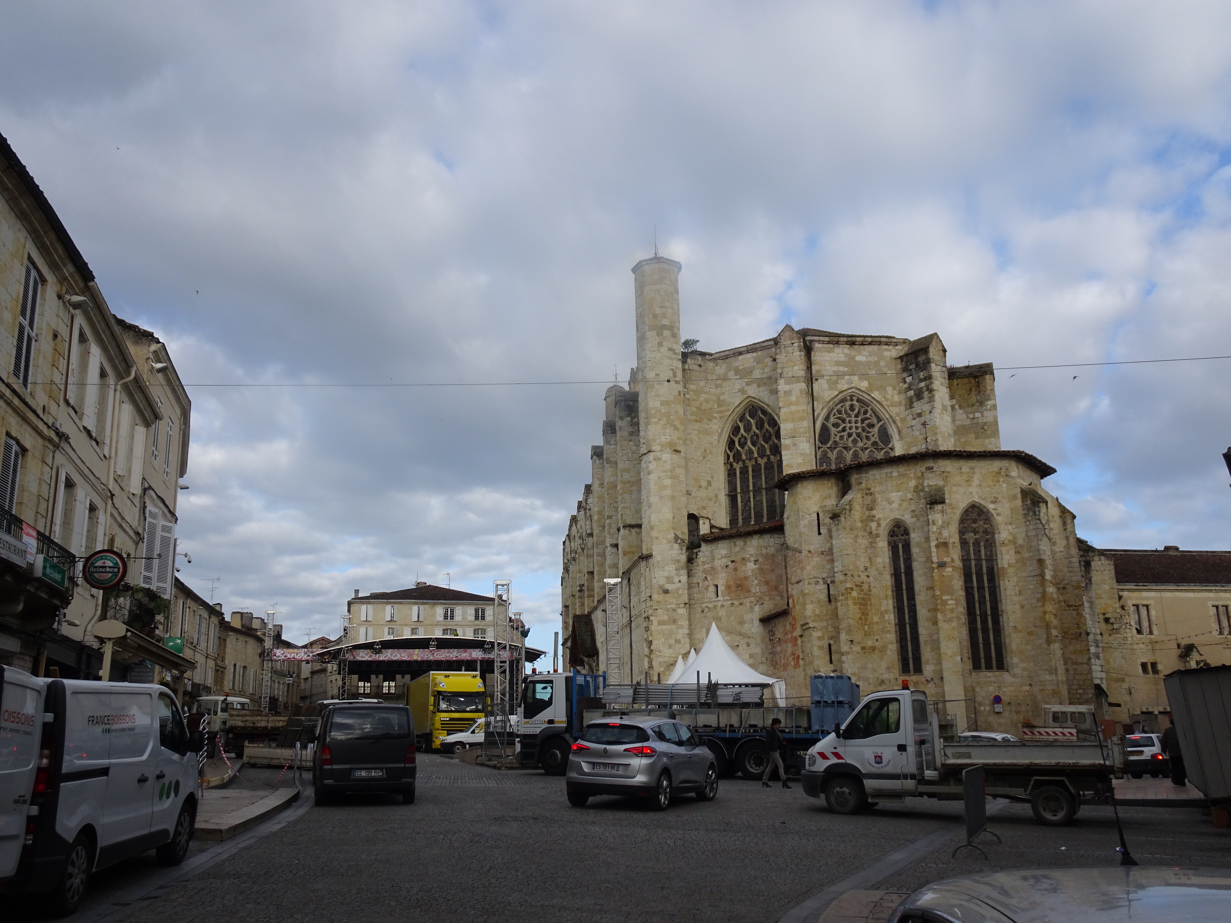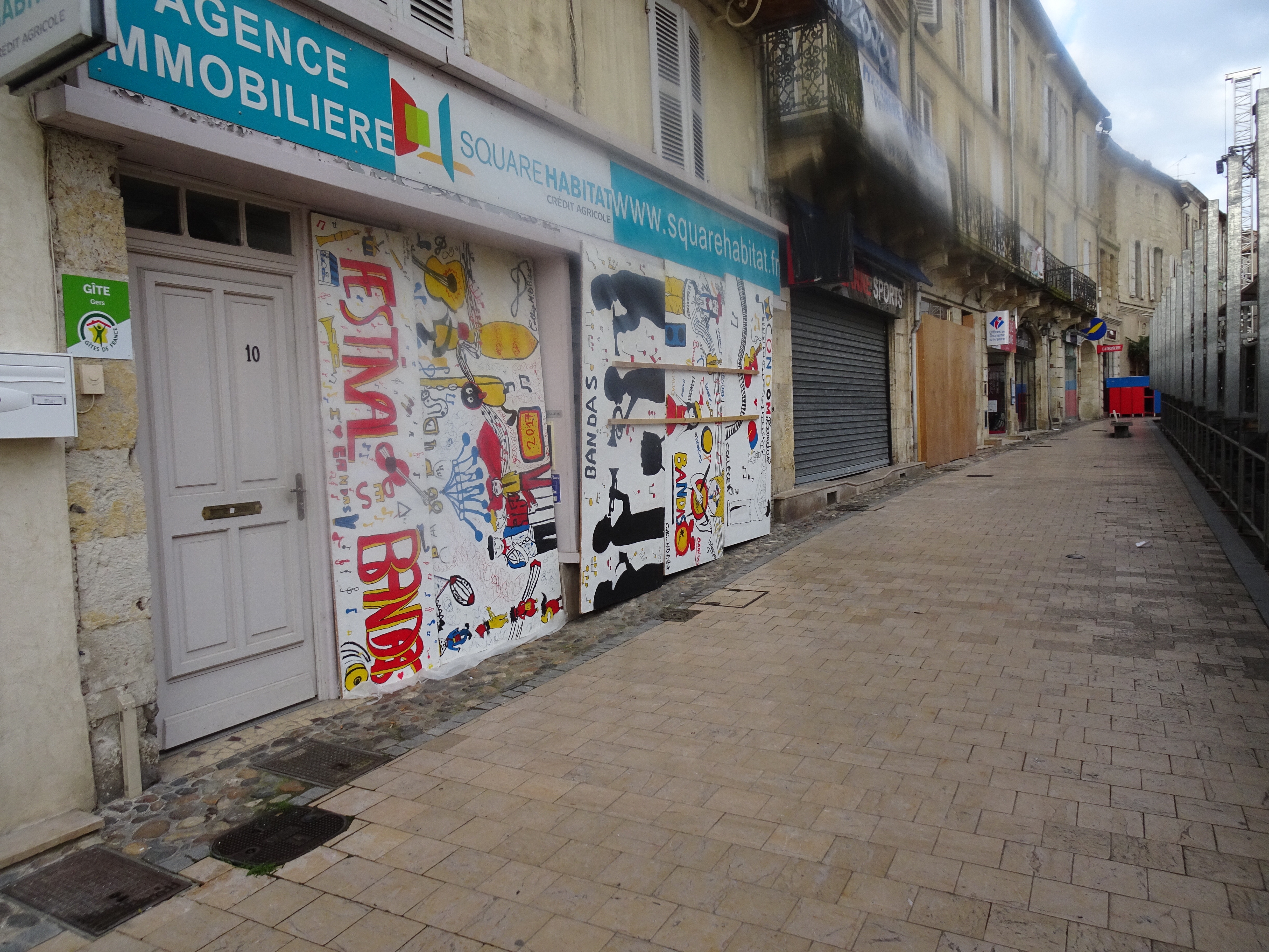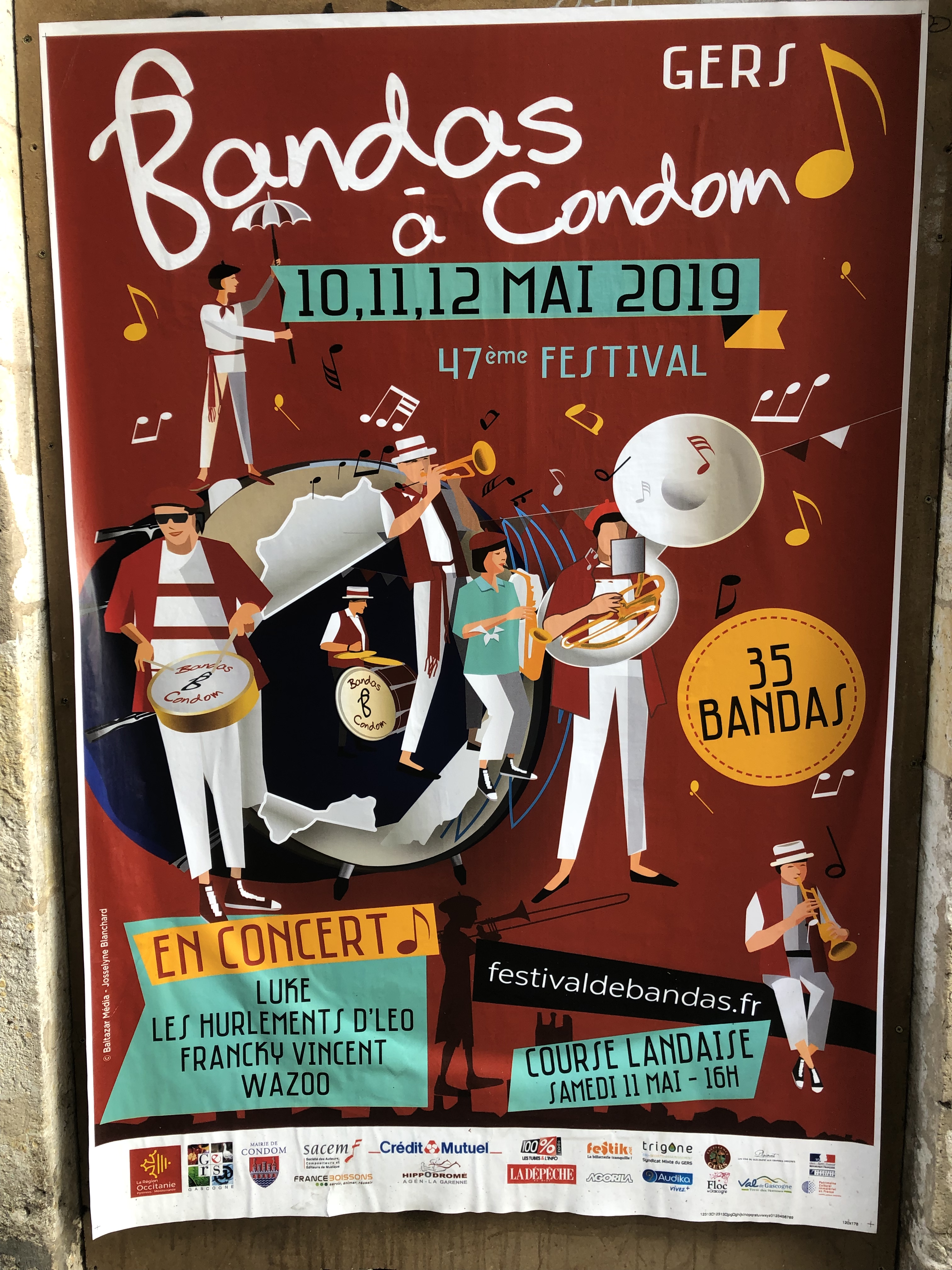 Le gîte étant situé à l’entrée de Condom, je dois traverser le centre historique qui est en préparation pour la 47ème année de son festival de bandas. 20 à 25000 personnes son attendues, les vitrines des commerces sont protégés par panneaux de bois! Une scène est montée sur la place devant la cathédrale, des tireuses à bière et des bars provisoires sont installés à différents endroits. C’est le premier festival de la saison, le dernier étant à Bayonne.