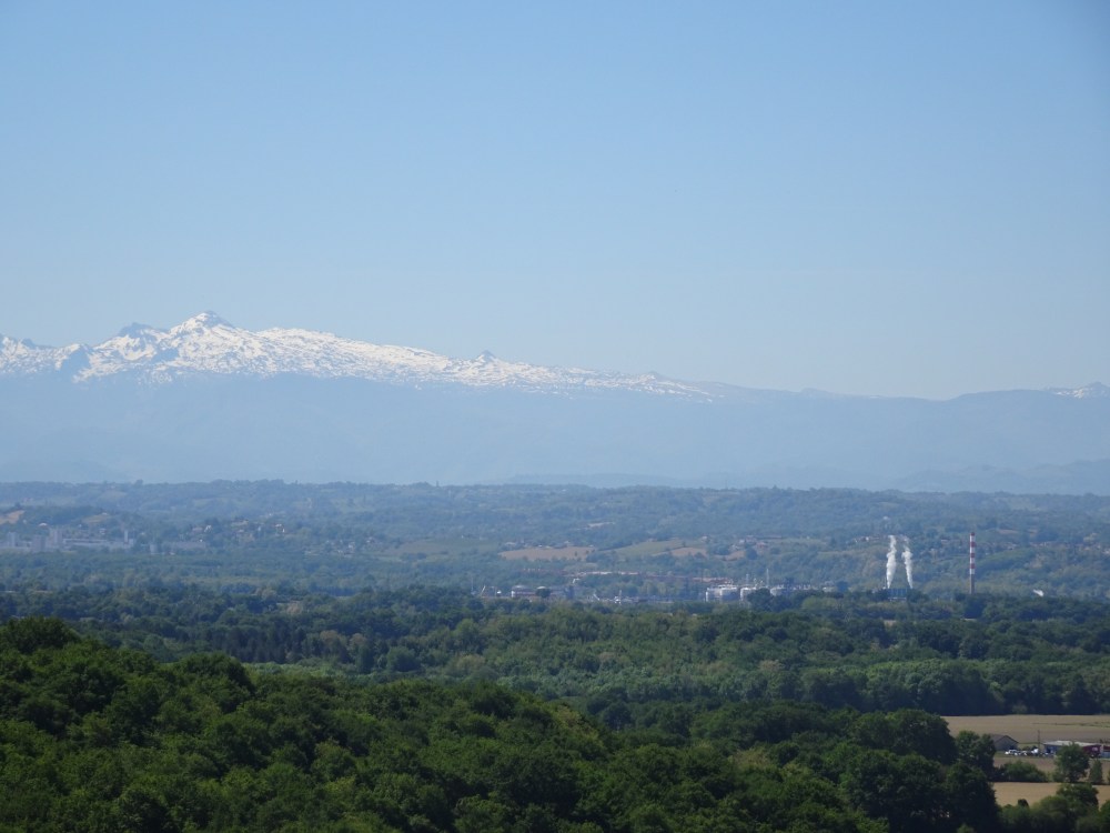 Le village de Arthez-de-Béarn est construit tout en longueur sur la crête avec une splendide vue au sud sur la barrière des Pyrénées mais également dans la vallée sur le gisement de production de gaz de Lacq. Vallée que je vais rejoindre puisque mon étape de ce soir est Maslacq juste de l’autre côté du Gave de Pau.