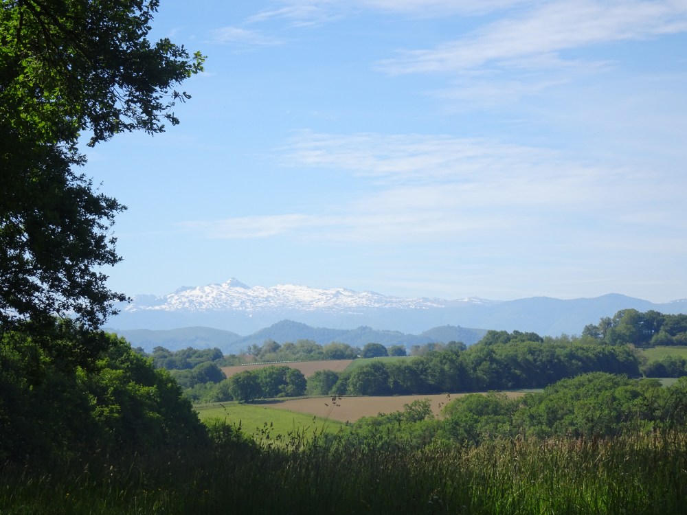 L’étape débute donc par la traversée de Navarrenx, ville fortifiée entourée de remparts, et juste en sortie par la traversée du Gave d’Oloron. Quelques routes forestières et chemins en sous-bois et je redécouvre à nouveau la vue sur les Pyrénées. Un peu plus loin mon gîte de ce soir et de demain, un donativo dont le propriétaire doit s’absenter, mais il me laisse les clefs, de quoi manger pour ce soir et demain midi, soit jusqu’à son retour. Un jeune couple de Parisiens est également hébergé dans ce gîte ce soir, couple déjà croisé à Conques, le 25 avril. Le gîte étant isolé en campagne, pas d’autre alternative que de se reposer.
