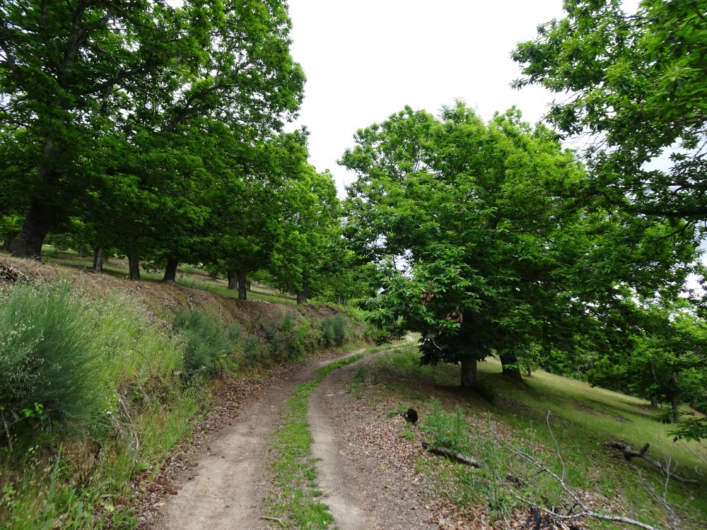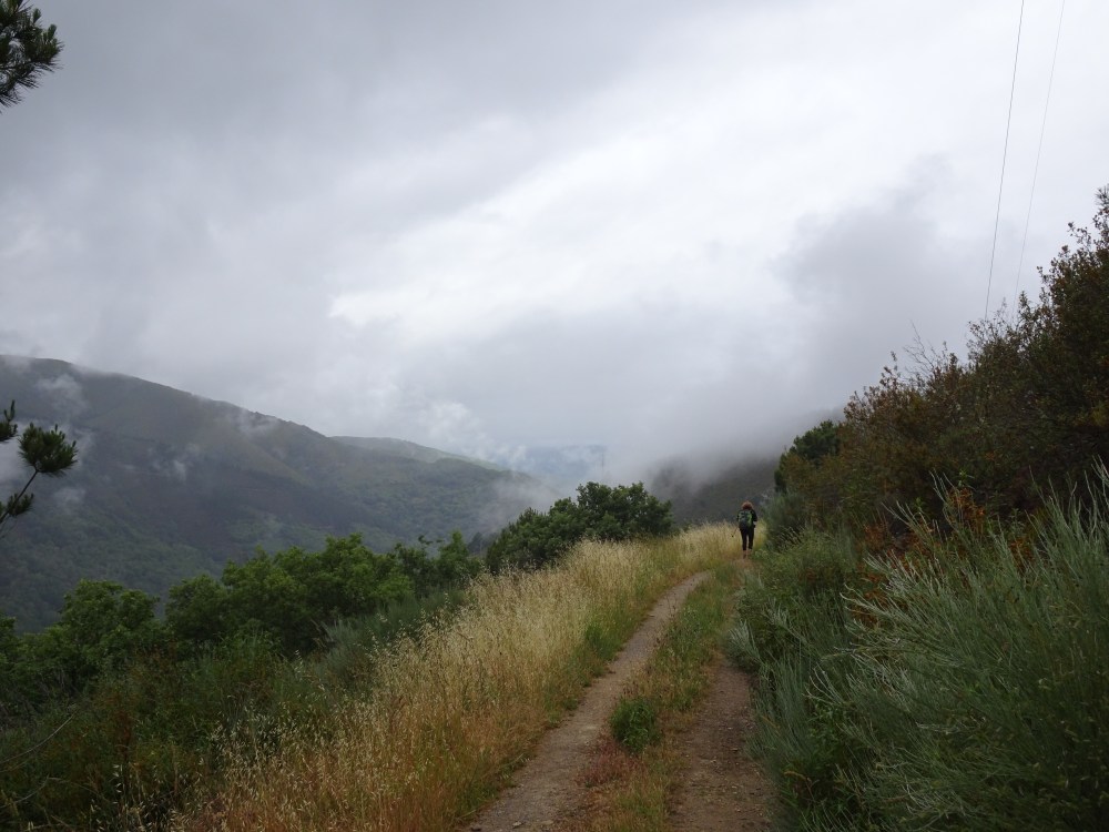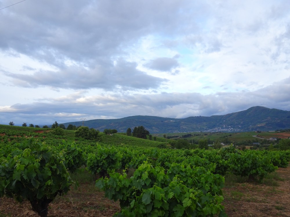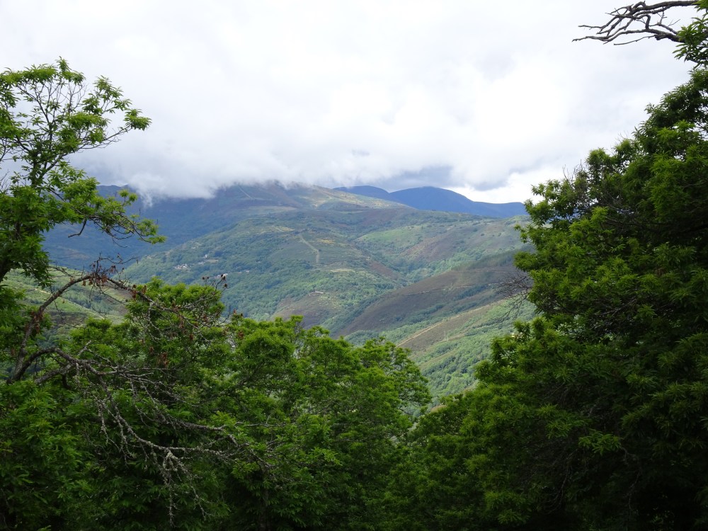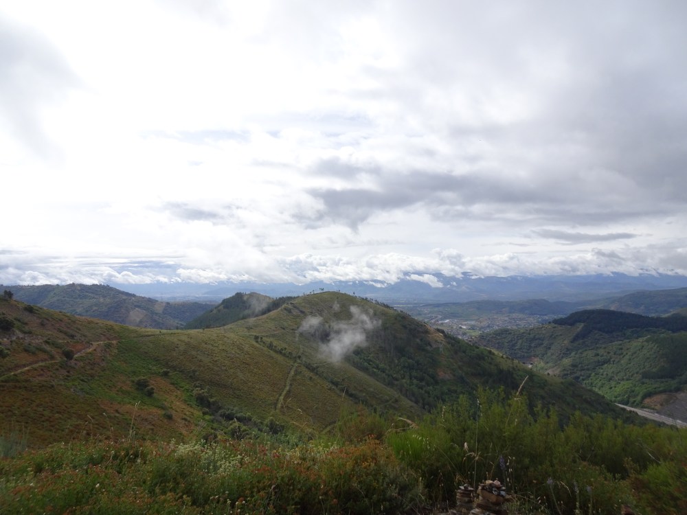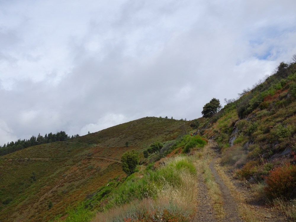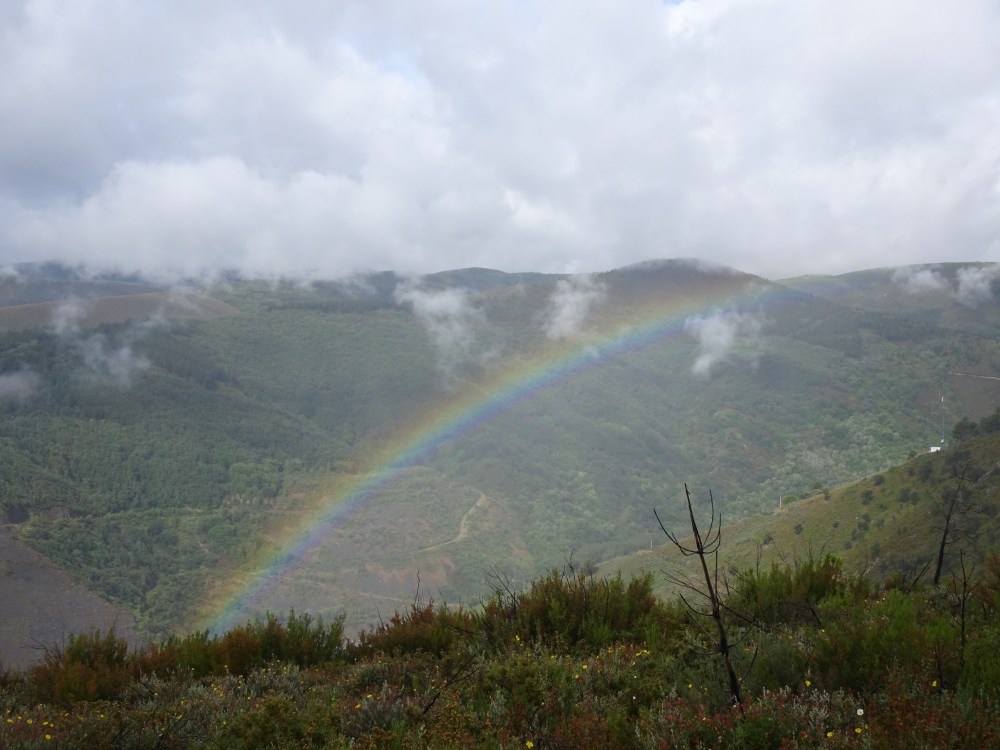 Ça grimpe dur dès les premiers mètres avec une pente à plus de 15% sur le premier kilomètre, puis en moyenne à 10% sur les deux suivants. Bien que le temps soit menaçant, le jeu en vaut la chandelle même si avec la montée en altitude je me retrouve finalement sous une petite ondée. Avec la hauteur le chemin et le paysage sont magnifiques. Le retour d’un rayon de soleil et un bel arc-en-ciel se dévoile en face dans la vallée. La pente s’adoucit avec quelques petits raidillons et je me retrouve à 931m au milieu des plantations de châtaigniers. Puis le chemin redescend pour retrouver le Camino Francés, la route, l’autoroute et le rio Valcarce, la vallée étant très étroite tout le monde doit y trouver son passage.