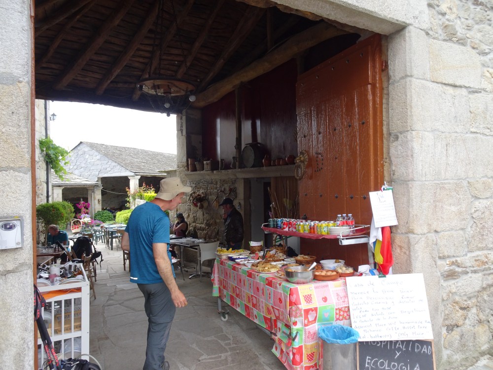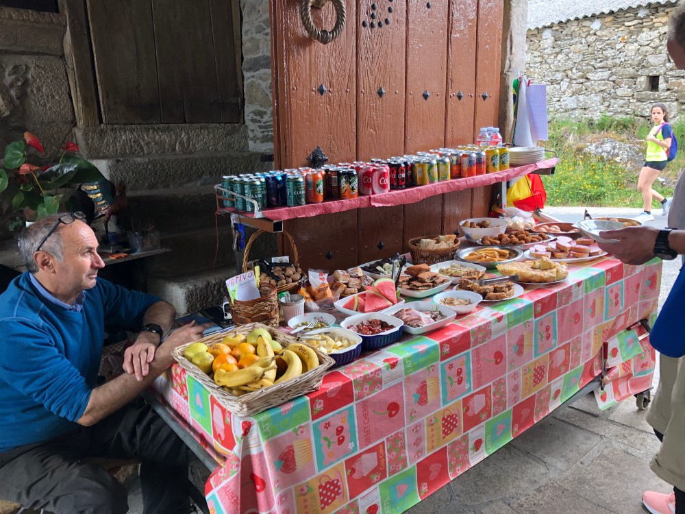 Aux trois quarts du chemin, un remarquable donativo qui propose toutes sortes de bonnes choses à manger. Salées, sucrées, du queso, du salchichón, des crêpes, des churros, des beignets, des torrejas et j’en oublie. J’ai eu du mal à en repartir. Rappel, le donativo ne veut pas dire que c’est gratuit, chacun donne en fonction de ce qu’il veut ou ce qu’il peut.