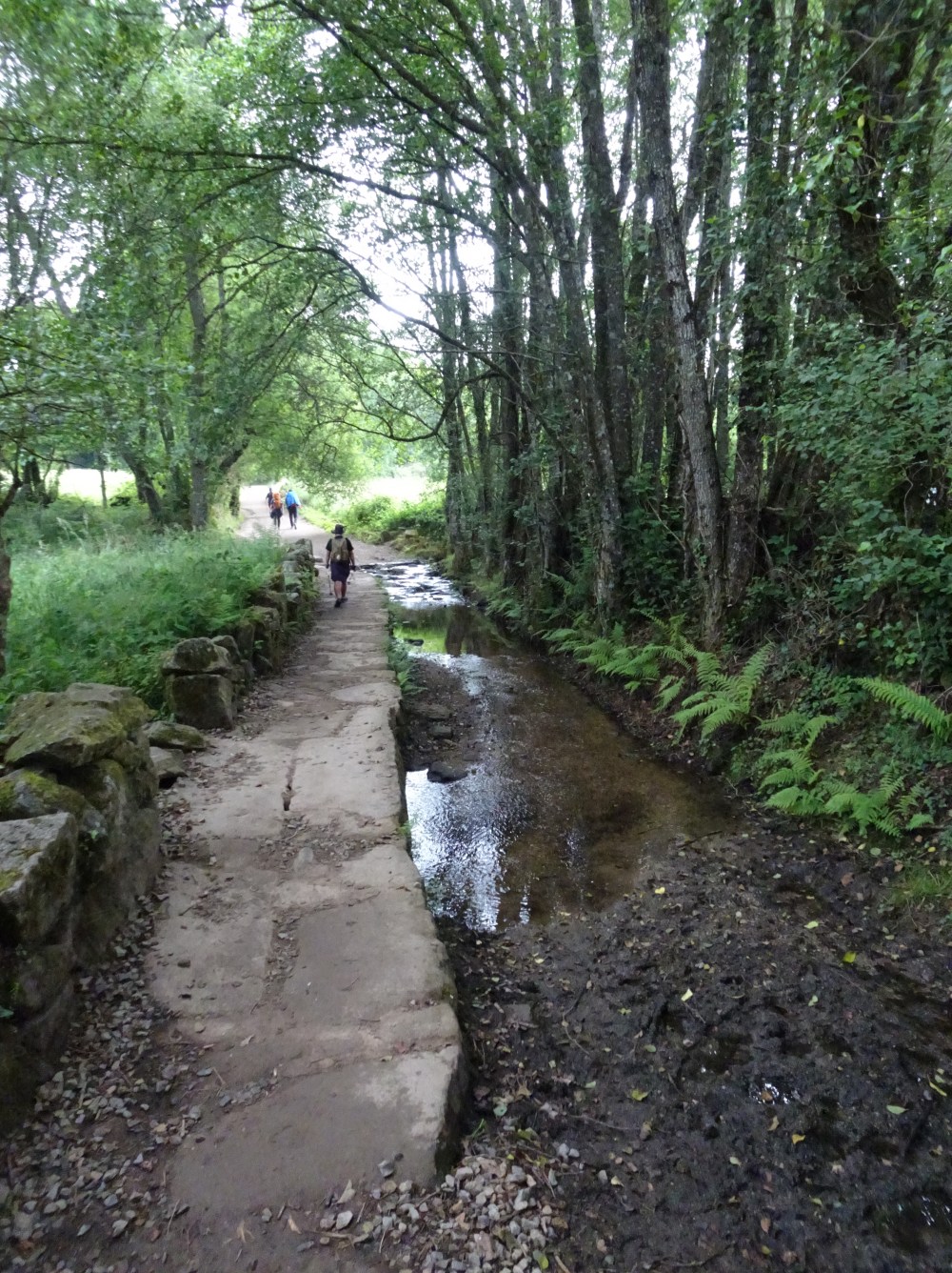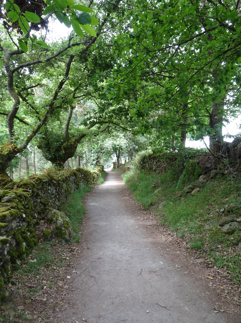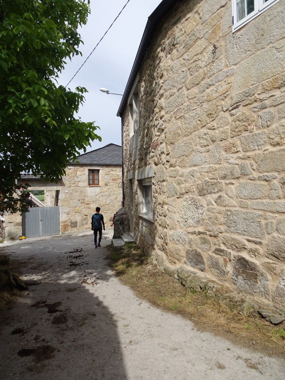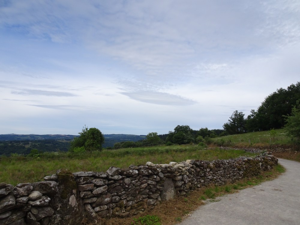 Donc énormément de monde ce matin sur le chemin. Très déroutant au début et puis en laissant passer les groupes d’adolescents, la beauté du chemin bordé de vieux murs en pierre, le passage aux milieux des fermes, j’arrive à fait abstraction de la foule. Il faut dire qu’il suffit juste d’être 2mn derrière un groupe pour se sentir seul. On démarre en s’élevant de 200m ce qui permet de voir la brume dans la vallée de Sarria.