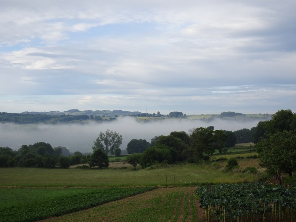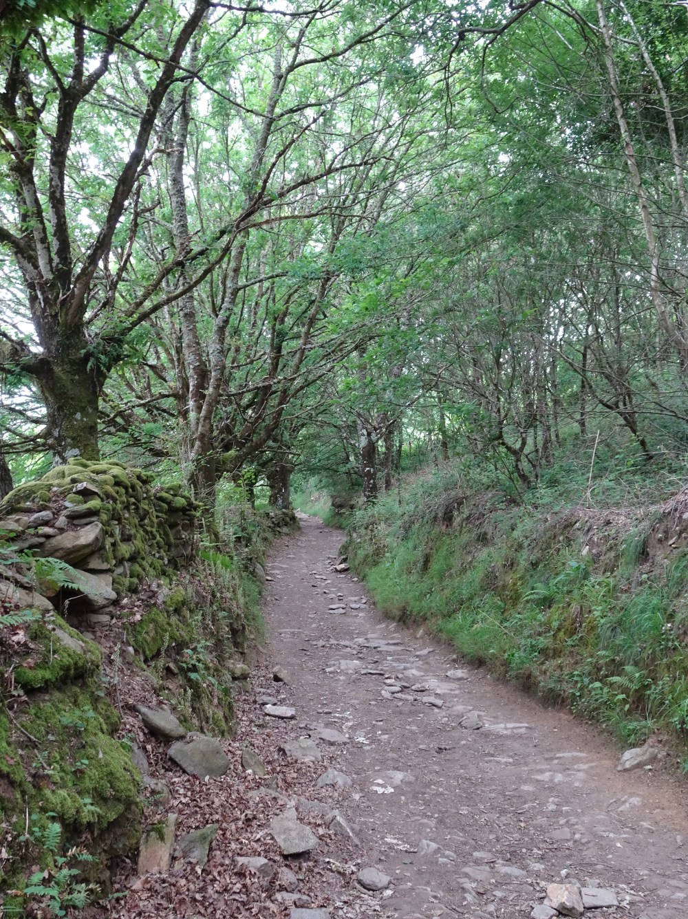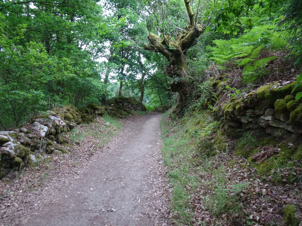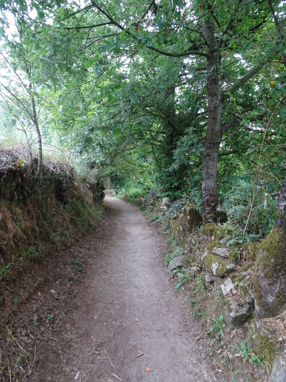 Donc énormément de monde ce matin sur le chemin. Très déroutant au début et puis en laissant passer les groupes d’adolescents, la beauté du chemin bordé de vieux murs en pierre, le passage aux milieux des fermes, j’arrive à fait abstraction de la foule. Il faut dire qu’il suffit juste d’être 2mn derrière un groupe pour se sentir seul. On démarre en s’élevant de 200m ce qui permet de voir la brume dans la vallée de Sarria.