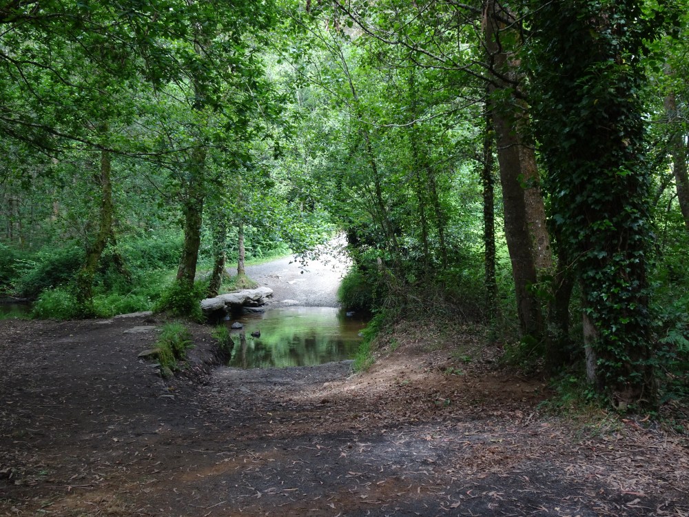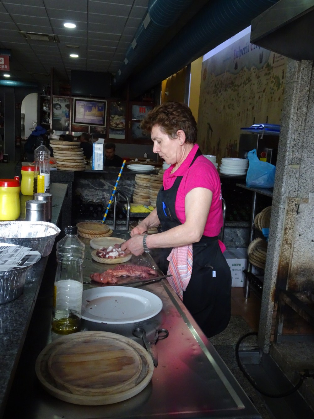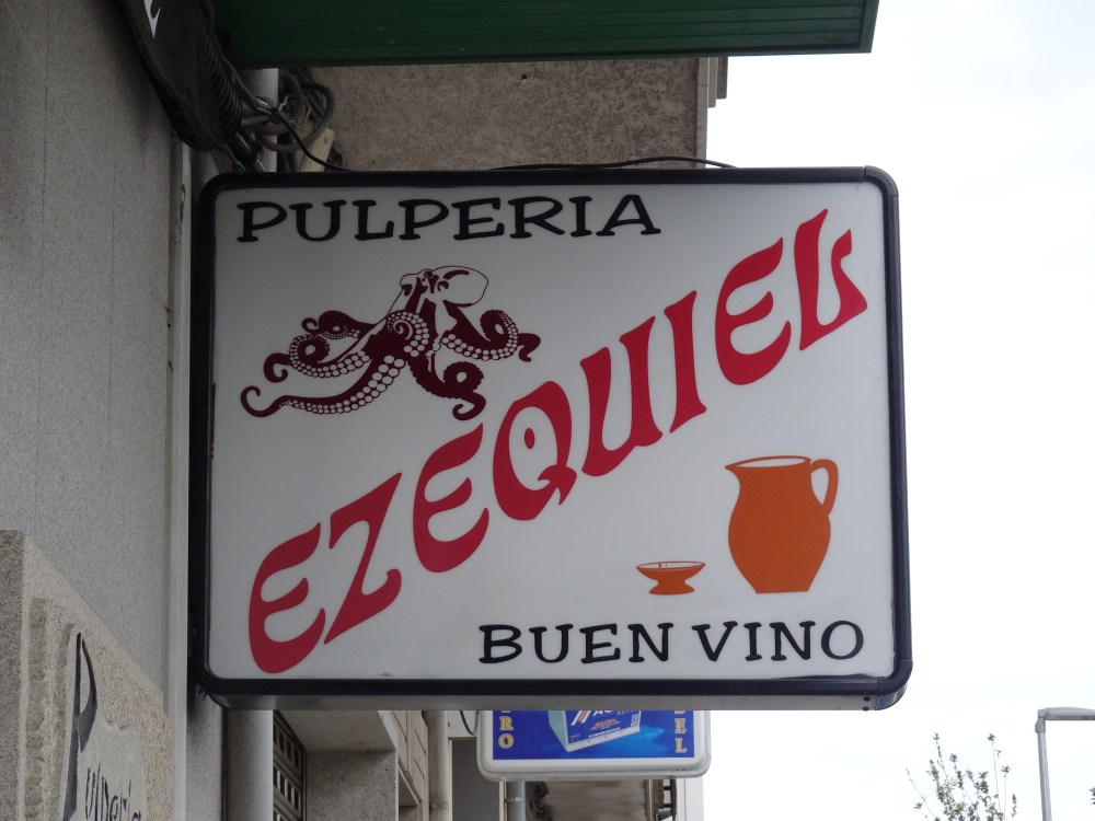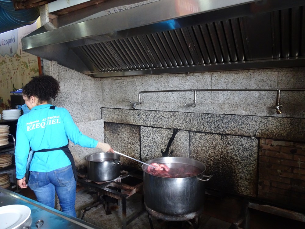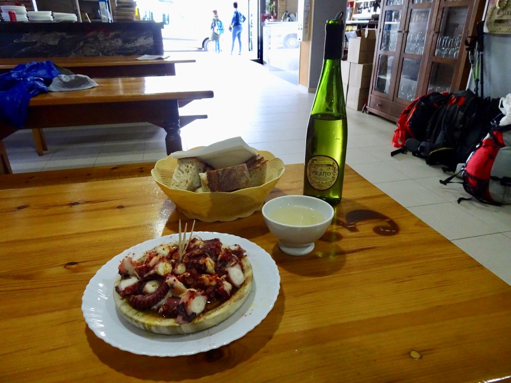 Sur les conseils de 2 pèlerins espagnols, qui s’y rendent également, je vais chez Ezequiel. Le décor est sommaire, 3 grands fourneaux à droite en entrant derrière un comptoir et de grandes tables et bancs en bois. Les premiers clients commence à arriver et je commande donc une ración de pulpo et du vino verde. Le poulpe est cuit dans des grands chaudrons, découpé en rondelles avec des ciseaux et servi recouvert de gros sel, de paprika et d’huile d’olive sur une assiette en bois avec palillos (cure-dents). Pour le vin, on vous pose la bouteille sur la table, un bol et lors de l’addition vous réglez la quantité consommée. C’est convivial. J’y suis rejoins par Gwenaelle et Marie-Annick, les 2 bretonnes, donc obligé de trinquer à nouveau au chemin. Il faut repartir et je ne sais pas qui du pulpo ou des 2 bols de vino verde m’a alourdi les jambes! Il reste quand même 11 kilomètres à parcourir.