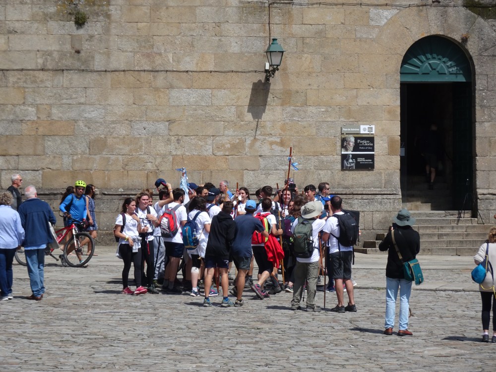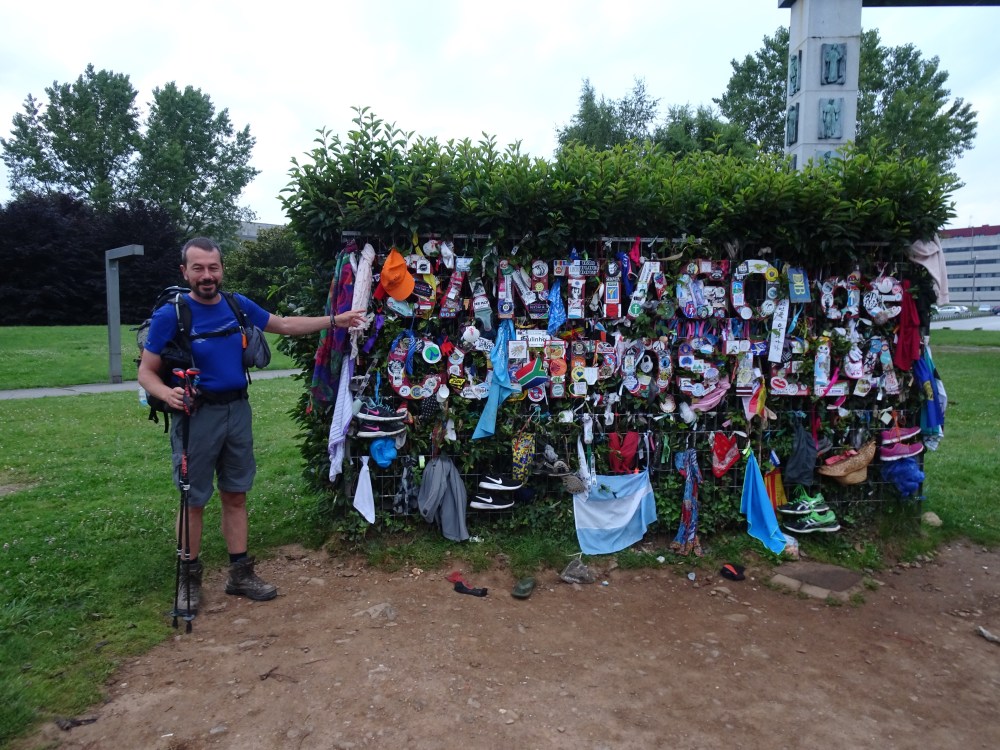 Pour cette dernière étape (26 juin) arrivant à la Cathédrale de Santiago, je souhaitais arriver seul et de bonne heure. Départ à 6h alors que le soleil à cette extrémité ouest de l’Espagne n’est pas encore levé, surtout que le ciel est plombé. Je prends donc ma lampe frontale et j’ai quelques doutes lors des premiers changements de direction. La pénombre donne une autre perspective au chemin. En arrivant dans les faubourgs de Santiago, je rencontre une Roumaine, la première je crois. On échange quelques mots et tour à tour on fait le photographe l’un pour l’autre, devant le monument de Monte do Gozo (mont de la joie), nommé ainsi puisque c’est d’ici que les pèlerins apercevaient pour la première fois les flèches de la cathédrale, puis quelques centaines de mètres plus loin devant les lettres SANTIAGO DE COMPOSTELA recouvertes d’objets divers et variés accrochés par les pèlerins.