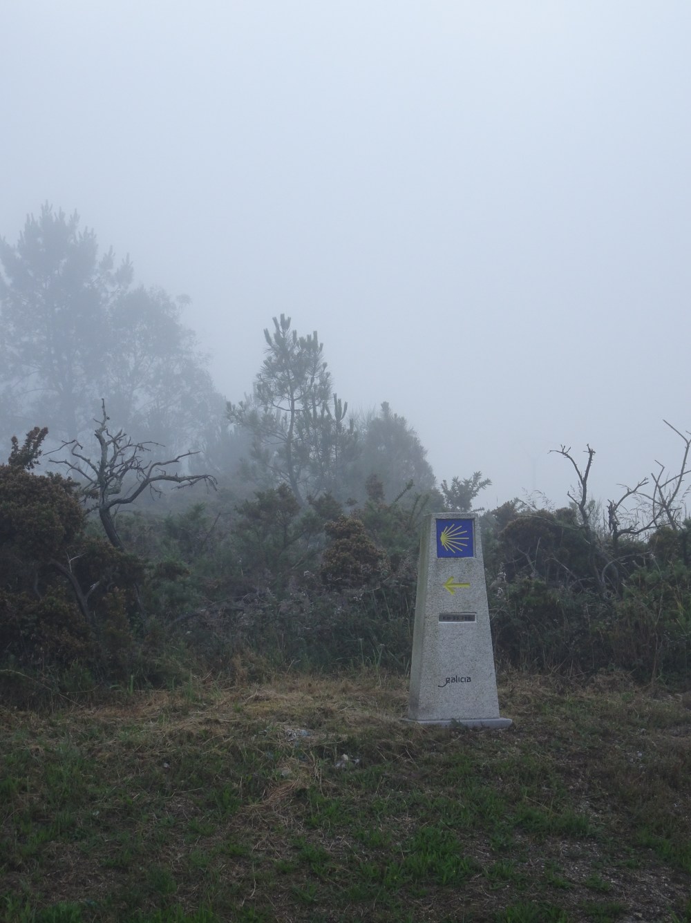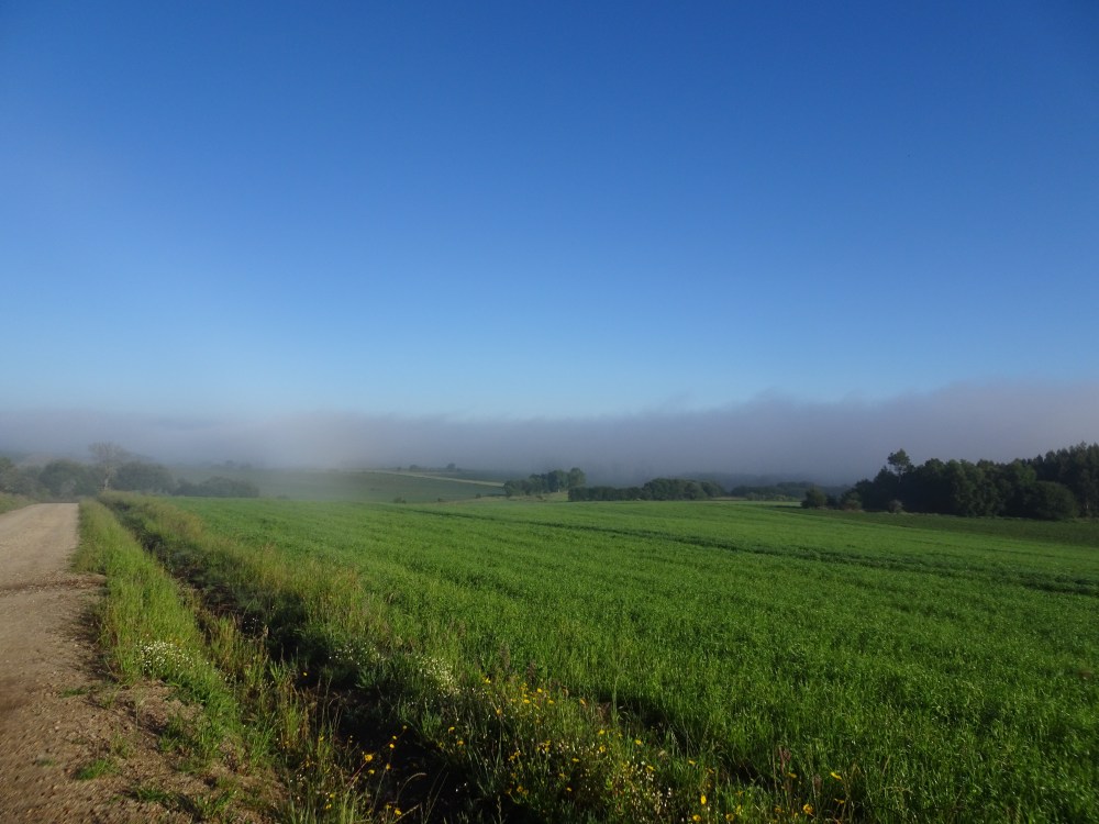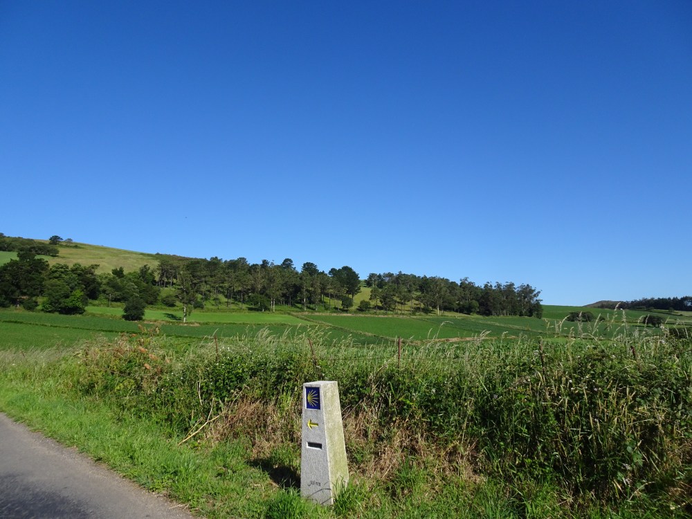 Départ ce matin, peu avant 8h soit une bonne heure plus tard que d’habitude, sans doute dû au fait de n’être que 4 dans le dortoir. On sent qu’il va faire beau, mais la légère brume n’est pas encore dissipée. Je rattrape au bout de 3km sur une portion en bord de route la Brésilienne, qui logeait dans la même albergue, qui marche lentement et qui a les larmes aux yeux. On essaye d’échanger quelques mots, mais comme elle ne parle que Portugais et moi, pas un mot, l’échange se termine rapidement. Je prends quelques dizaines de mètres d’avance et alors que l’on s’est engagé sur une large piste en montée, j’entends son pas rapide, son souffle saccadé derrière moi. Je comprends qu’elle essaye de me suivre et que je marche trop vite pour elle. Je ralentis mon allure et m’adapte à son rythme. Après quelques laborieux échanges, 1/3 portugais, 1/3 espagnol et le 3ème tiers par gestes, je comprends qu’elle a peur de marcher seule avec cette brume et surtout de passer près des bosquets. Elle savait que j’étais parti après elle et attendait donc mon arrivée. Elle se positionne derrière moi quand on croise un Espagnol accompagné de son berger allemand. Elle arrive à m’expliquer qu’elle fait le Camino pour son fils autiste mort en décembre. Tout ce que je peux faire est de l’accompagner le temps que la brume se dissipe, que l’on retrouve la route, un village et d’autres pèlerins en visuel. Je traîne depuis le départ un petit sifflet SOS orange accroché à un mousqueton sur mon sac. Je les lui offre et lui montre qu’elle peut ainsi siffler en cas de danger. Je me sens démuni. j’ai fait le peu que je pouvais.