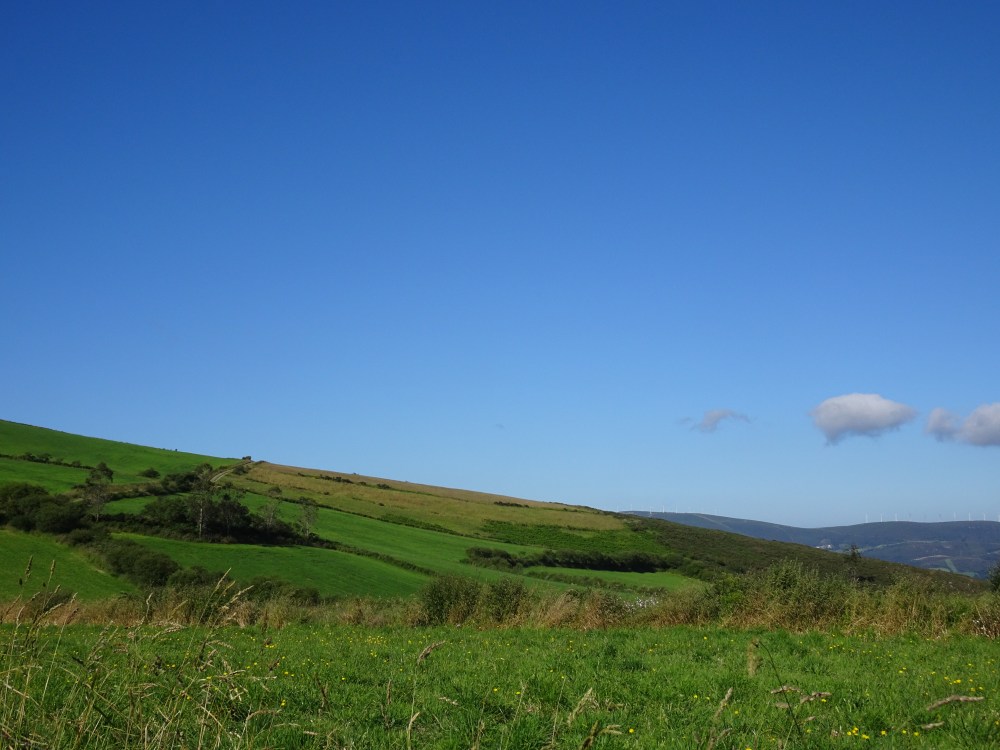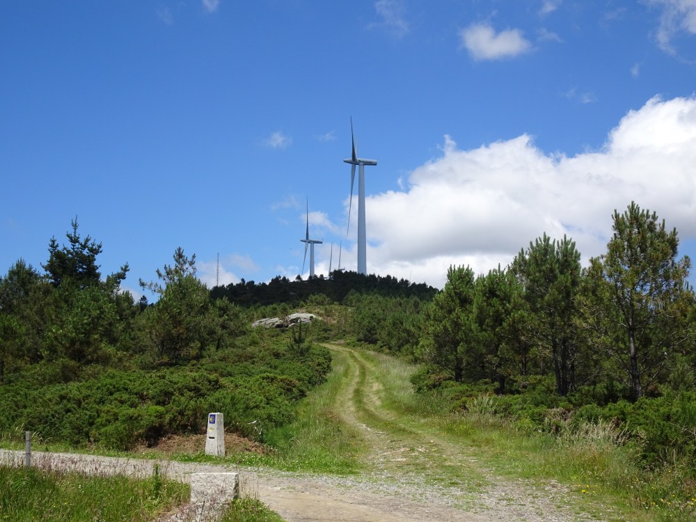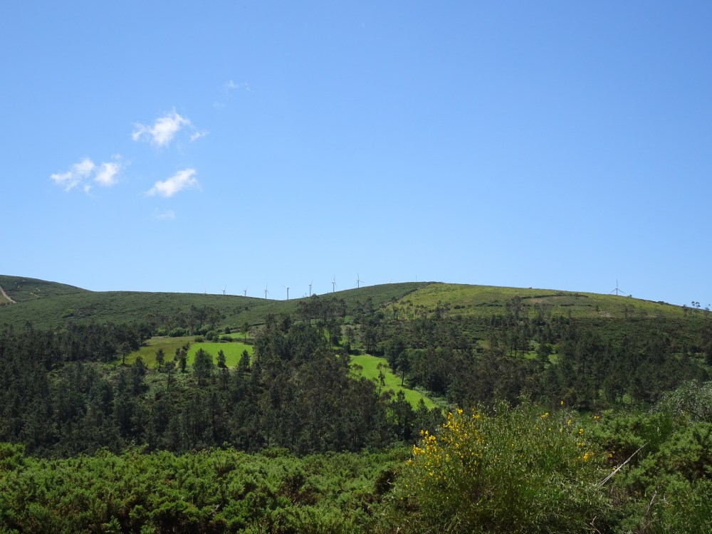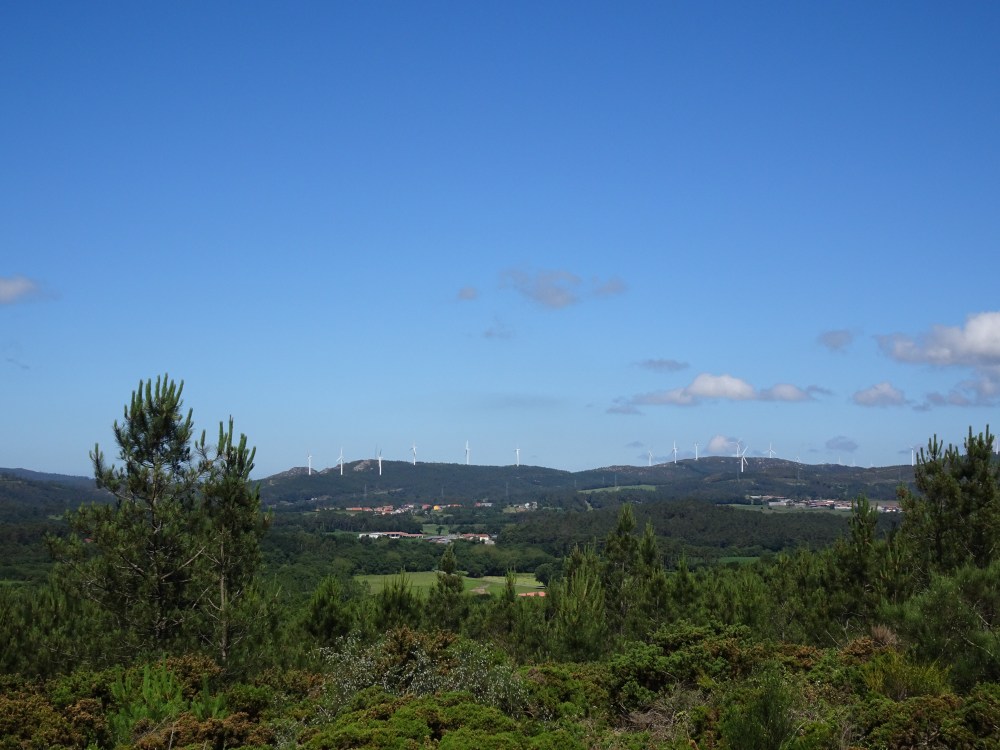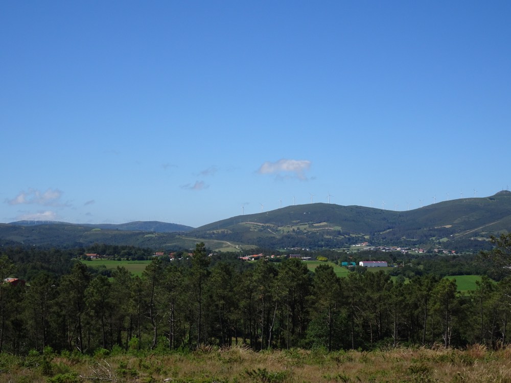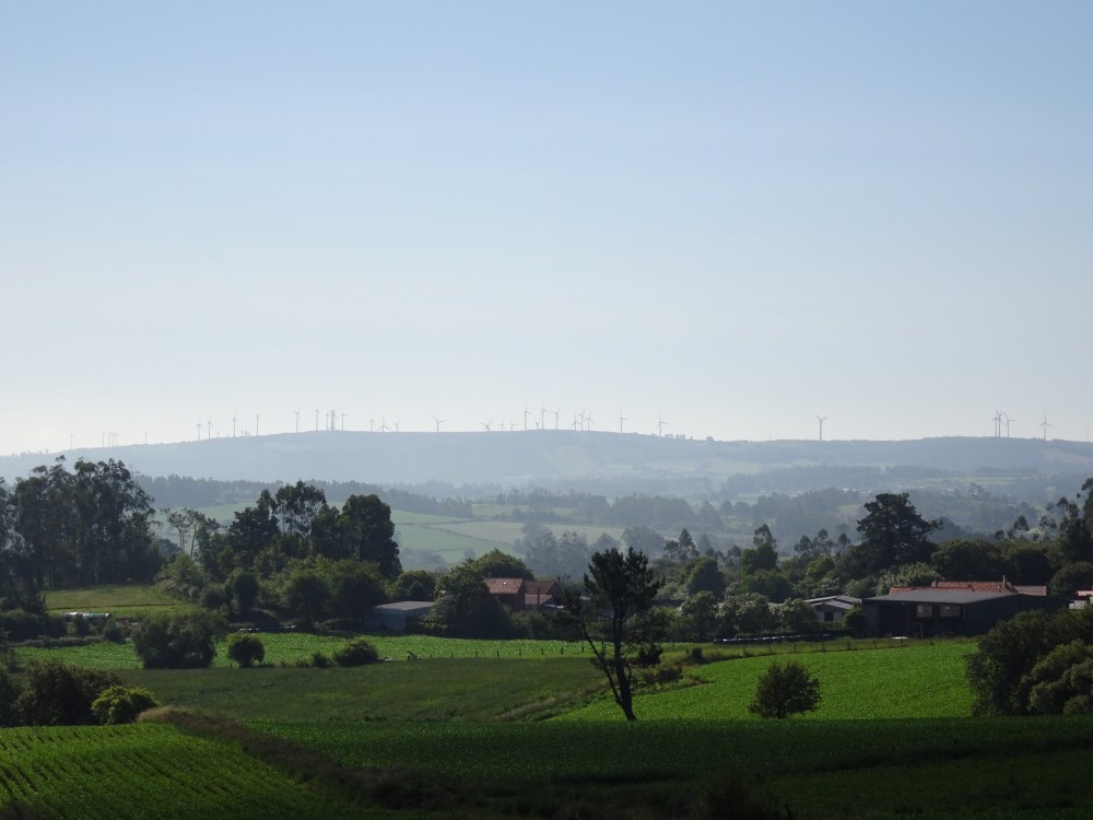L’étape du jour est différente de celle d’hier, beaucoup de bitume, sur des petites routes de campagne. On ne traverse que des petits villages où il n’y a que quelques fermes, quelques habitations et s’il y a un ou plusieurs commerces ce sont des bars-albergues. On entend les coups de klaxon de la camionnette qui dépose dans des sacs le pain devant les maisons. Le paysage est vallonné, des prairies, des cultures et des alignements d’éoliennes sur les sommets des collines. Après Oliveiroa, le paysage devient sauvage. Je trouve une place à l’unique albergue d’Hospital. J’aurais souhaité poursuivre pour me rapprocher de Finisterre, mais il y a “un trou » de 15 kilomètres sans aucun village, donc aucune possibilité de logements.