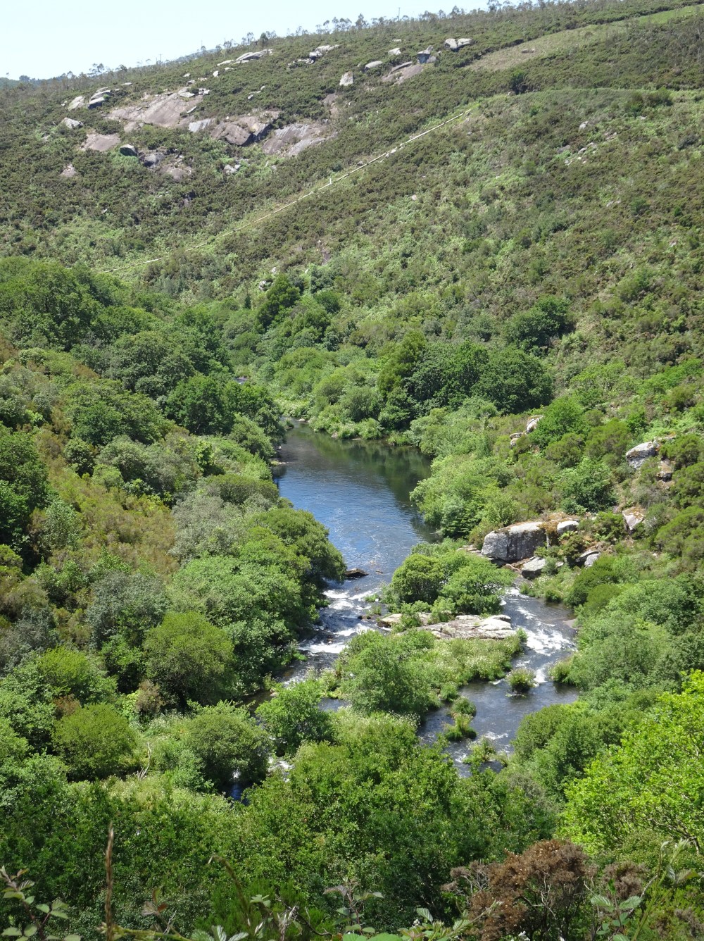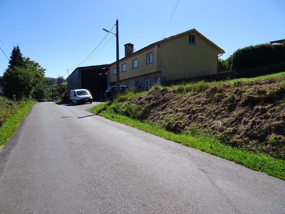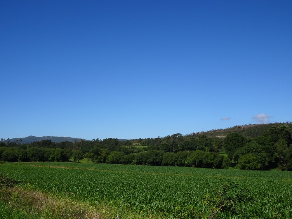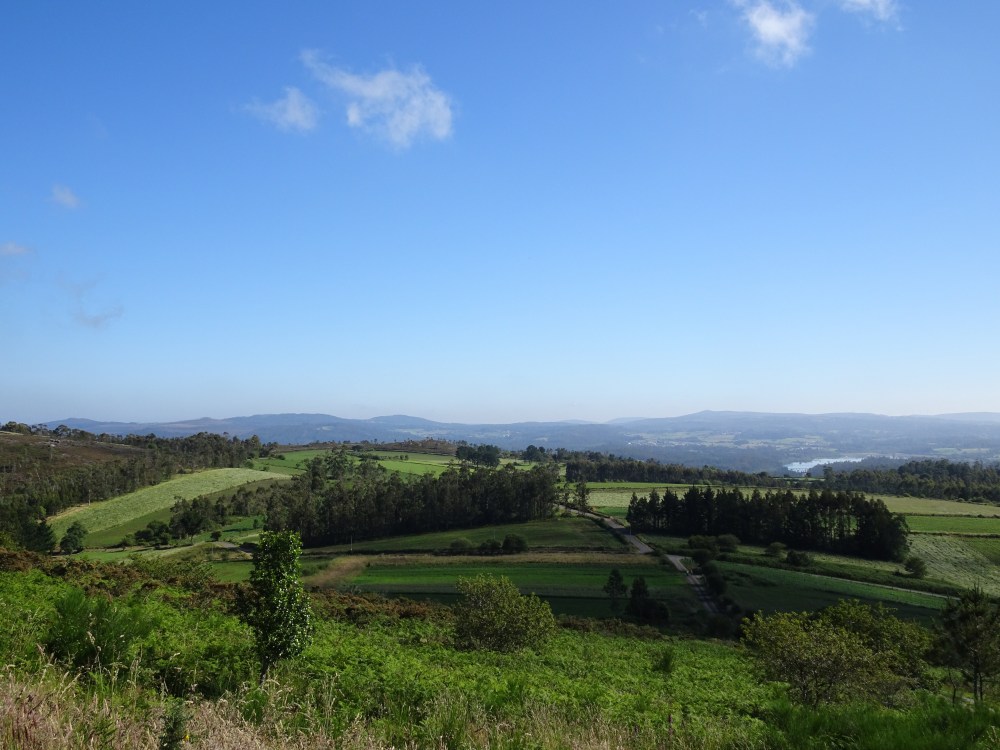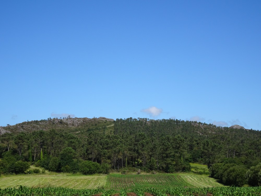 L’étape du jour est différente de celle d’hier, beaucoup de bitume, sur des petites routes de campagne. On ne traverse que des petits villages où il n’y a que quelques fermes, quelques habitations et s’il y a un ou plusieurs commerces ce sont des bars-albergues. On entend les coups de klaxon de la camionnette qui dépose dans des sacs le pain devant les maisons. Le paysage est vallonné, des prairies, des cultures et des alignements d’éoliennes sur les sommets des collines. Après Oliveiroa, le paysage devient sauvage. Je trouve une place à l’unique albergue d’Hospital. J’aurais souhaité poursuivre pour me rapprocher de Finisterre, mais il y a “un trou » de 15 kilomètres sans aucun village, donc aucune possibilité de logements.